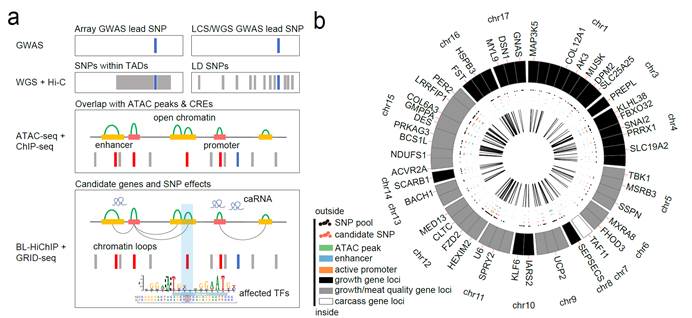 为了解决上述问题,本研究应用GRID-seq技术和课题组自主开发的BL-HiChIP技术,分别构建了高分辨率RNA-染色质互作图谱和染色质-染色质互作图谱,通过联合分析,在全基因组水平解析了caRNA及染色质三维构象在基因表达中的精细调控作用,揭示了使用高分辨率染色质互作图谱探究顺式调控元件与靶基因之间精确调控关系的重要性。同时,运用整合组学策略,对猪15个产肉相关性状(包括饲料转化率、平均日增重、滴水损失等)的GWAS信号进行了解析,鉴定出54个重要候选主效基因和223个突变。该结果为猪产肉性状遗传机理解析奠定了重要基础,也为猪产肉性状改良提供了重要支撑。同时,本研究策略也为猪复杂经济性状遗传机理的解析提供了新思路。