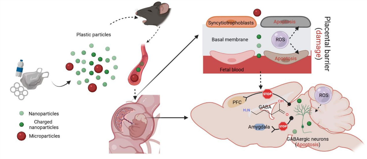 人类精神疾病或神经退行性疾病(自闭症、精神分裂症、抑郁症、阿尔茨海黙病、帕金森病等)的病因一直未能阐明清楚,然而一些研究将其指向环境因素。丁一研究团队通过将孕鼠暴露于不同粒径大小和不同表面修饰的塑料颗粒,探究其对胎儿神经发育的影响,揭示人类精神病或神经退行性疾病的潜在发病原因。