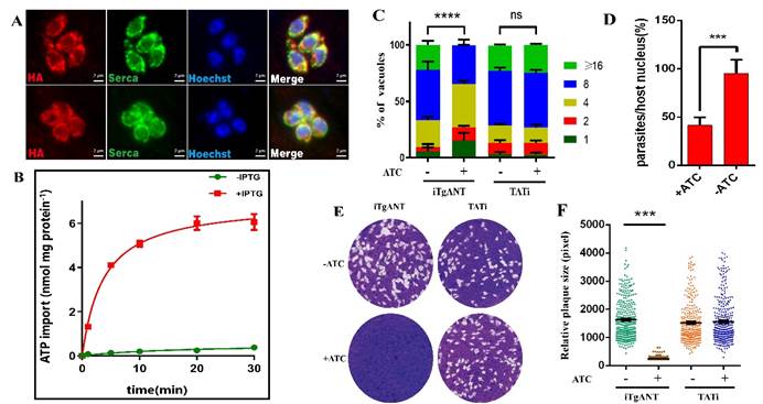 图1:TgANT在弓形虫中的定位、ATP吸收能力检测以及表型研究