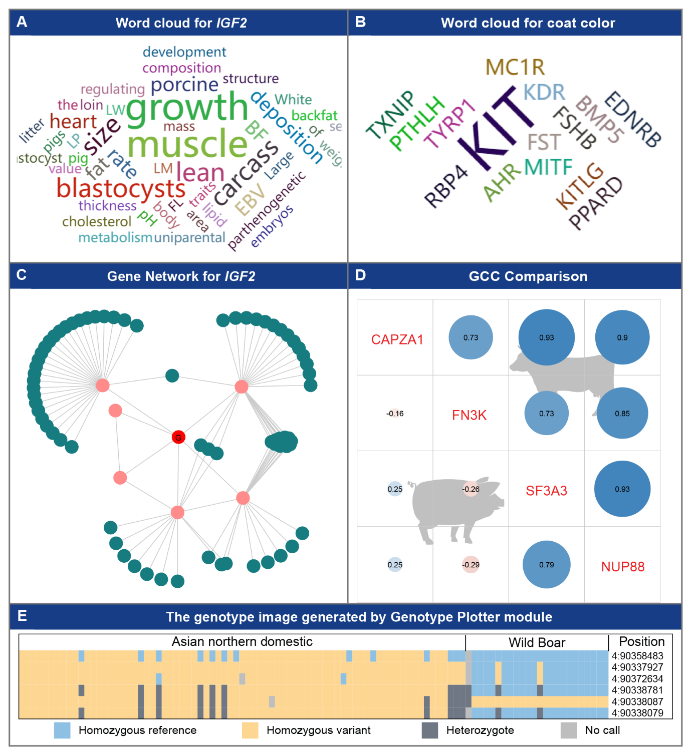 IAnimal调用案例。A、通过文献组学数据可视化结果直观判断IGF2基因和肌肉生长相关;B、通过数据可视化结果判断KIT、MITF等基因和毛色相关;C、与IGF2高度相关的基因构成的调控网络;D、CAPZA1、FN3K、SF3A3和NUP88基因在猪和牛之间的调控模式比较;E、亚洲北方家猪和野猪在指定位点的基因型分布。