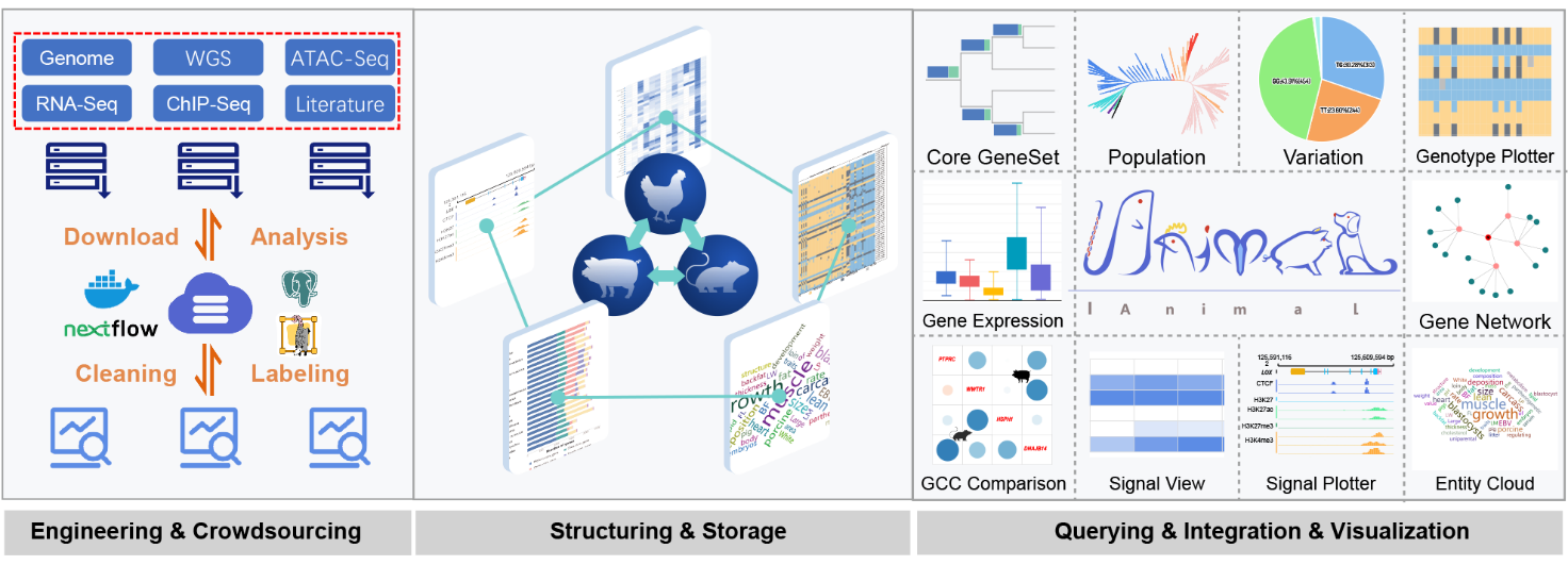 (通讯员:刘小磊、付玉华)近日,赵书红教授团队在《Nucleic Acids Research》期刊在线发表了题为“IAnimal: A cross-species omics knowledgebase for animals”的研究成果。本研究发布了国际规模最大的动物跨物种多组学知识库,对猪、鼠、鸡、狗等21个物种的WGS、RNA-Seq、ChIP-Seq、ATAC-Seq等生物多维组学数据以及文献组数据进行了统一清洗和分析,提供了灵活的数据API接口和便捷的数据挖掘工具,极大的提升了公共组学大数据的复用性,为大数据驱动的动物智能育种奠定了基础。