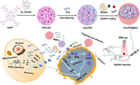 图1. Arg-PCN@Gel的制备及其靶向协同光动力疗法和营养免疫疗法的示意图