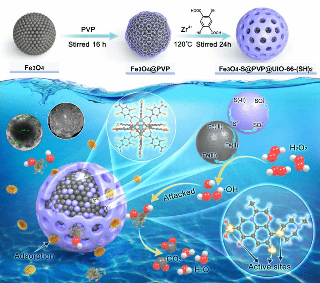 (通讯员 李定堂)近日,公司bevictor伟德精准兽药创制与环境消减技术开发团队设计了具有核壳结构和硫掺杂特征的多功能金属有机骨架材料,实现了对抗菌药物的高效吸附和协同降解。相关成果以“S-doped core-shell heterojunction Fenton catalyst (Fe3O4-S@PVP@UIO-66-(SH)2) for enhanced activation of hydroxyl radical: synergistic enrichment and degradation mechanism”为题发表在Chemical Engineering Journal上。本研究通过在四氧化三铁团簇内外同时生长巯基化锆基金属有机骨架,构建了具有高效吸附性和过氧化氢活化性能的多相芬顿催化纳米材料,同时结合理论计算与试验结果系统地探究了引入非金属克服铁活性位点失活的机制。