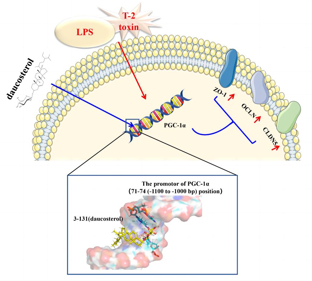 T-2毒素是食品和动物饲料中常见的污染物,给人类和动物的健康带来了巨大挑战。前期研究显示,T-2毒素可以透过血脑屏障并导致神经损伤。研究显示,PGC-1α与脑部疾病密切相关,且在多种疾病引起的血脑屏障损伤中起保护作用。研究团队发现PGC-1α是拮抗T-2毒素所致血脑屏障损伤的重要靶点,在神经损伤中具有保护作用。然而基于PGC-1α为靶点的激动剂的筛选主要集中于小分子化合物激活PGC-1α的基因表达,未能对具体结合位点、靶向性和特异性进行分析。因此,寻找新的特异性PGC-1α激动剂拮抗T-2毒素造成的脑损伤尤为重要。