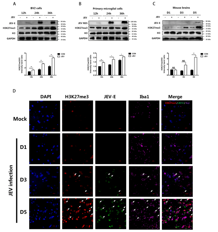 研究人员首先发现JEV感染会导致小鼠小胶质细胞系BV2、原代胶质细胞和小鼠脑组织中H3K27me3水平明显上调,并利用甲基化转移酶EZH2抑制剂证明H3K27me3修饰可能在JEV诱导的小胶质细胞炎症中发挥重要的调控作用。