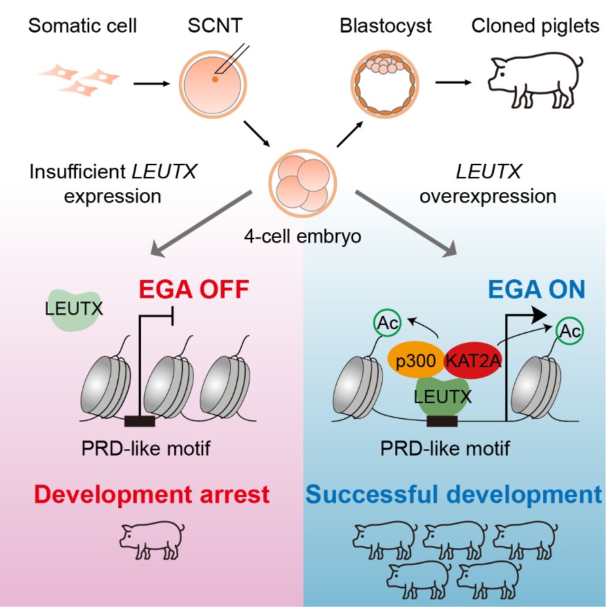 (通讯员:刘鑫、周凯)近日,公司苗义良教授领衔的动物克隆与干细胞研究团队在Cell Reports发表了题为“LEUTX regulates porcine embryonic genome activation in somatic cell nuclear transfer embryos”的最新研究成果。该研究全面系统地揭示了猪特异性转录因子LEUTX对体细胞重编程的调控机制,并为提高猪的克隆效率提供了新方法。