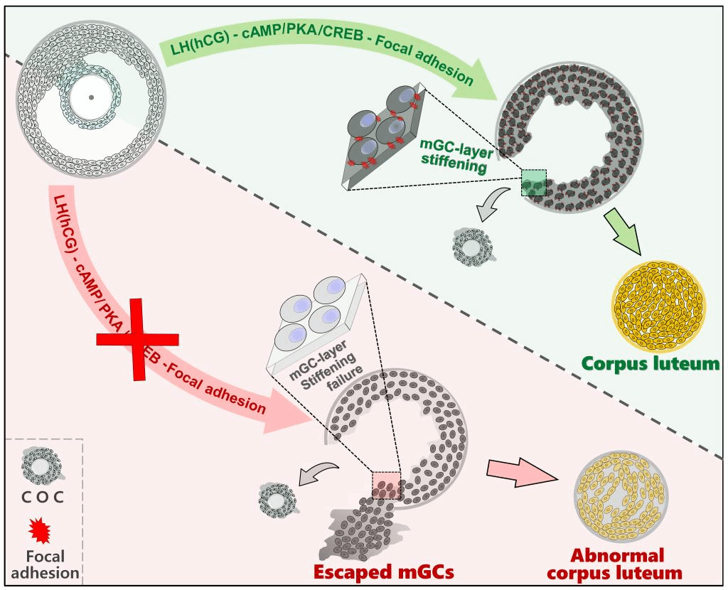 英文摘要:Ovulation is vital for successful reproduction. Following ovulation, cumulus cells and oocyte are released, while mural granulosa cells (mGCs) remain sequestered within the post-ovulatory follicle to form the corpus luteum. However, the mechanism underlying the confinement of mGCs has been a longstanding mystery. Here, in vitro and in vivo evidence is provided demonstrating that the stiffening of mGC-layer serves as an evolutionarily conserved mechanism that prevents mGCs from escaping the post-ovulatory follicles. The results from spatial transcriptome analysis and experiments reveal that focal adhesion assembly, triggered by the LH (hCG)-cAMP-PKA-CREB signaling cascade, is necessary for mGC-layer stiffening. Disrupting focal adhesion assembly through RNA interference results in stiffening failure, mGC escape, and the subsequent development of an abnormal corpus luteum characterized by decreased cell density or cavities. These findings introduce a novel concept of “mGC-layer stiffening”, shedding light on the mechanism that prevents mGC escape from the post-ovulatory follicle.