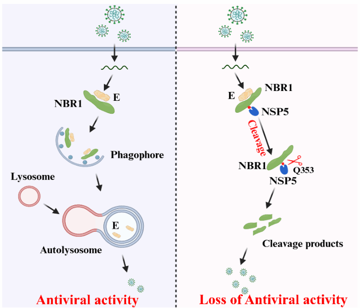 研究发现,宿主选择性自噬受体NBR1与猪德尔塔冠状病毒(PDCoV)的E蛋白相互作用,并通过自噬-溶酶体途径降解E蛋白,显著抑制PDCoV增殖。然而,PDCoV编码的NSP5蛋白酶能够特异性地切割自噬受体NBR1,破坏其选择性自噬功能,从而逃逸宿主的抗病毒反应。进一步研究发现,新冠病毒(SARS-CoV-2)及其它冠状病毒的NSP5蛋白也具备相同的NBR1切割能力,提示冠状病毒可能普遍采用该机制以对抗宿主抗病毒反应。