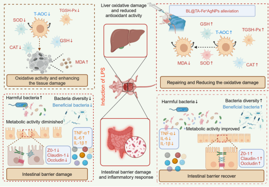 该复合材料以活性地衣芽孢杆菌(BL)为核心,通过单宁酸-铁离子(TA-FeIII)配位层包覆,并原位锚定超小尺寸银纳米颗粒(AgNPs)。表征结果证实其结构完整、胃肠道环境耐受性好且细胞毒性低。该体系在模拟胃肠液中展现出优异的益生菌保护能力和对致病菌(如大肠杆菌、金黄色葡萄球菌)的有效杀灭活性。在脂多糖(LPS)诱导的小鼠肠道损伤模型中,BL@TA-FeIII@AgNPs展现出显著的肠道保护与修复功效:有效降低小鼠炎症、改善肠道屏障损伤、降低氧化损伤标志物丙二醛水平。尤为关键的是,通过16S rRNA基因测序和非靶向代谢组学(LC-MS/MS)分析盲肠内容物发现,该复合系统能显著重塑紊乱的肠道菌群结构和代谢物网络。综合体内外生物安全性评估表明其耐受性良好,并能有效修复LPS诱导的肠道屏障损伤,恢复肝脏抗氧化能力。该研究证明BL@TA-FeIII@AgNPs通过巧妙融合益生菌功能与纳米技术,实现了抗菌、抗炎、靶向递送与微生态调节的多效协同,为恢复肠道稳态、屏障完整性和抑制氧化炎症级联反应提供了强大且安全的治疗潜力。这一突破性成果标志着纳米医学与微生物组疗法在应对复杂胃肠道疾病领域的重要融合,为开发下一代肠道炎症治疗药物提供新的思考角度。