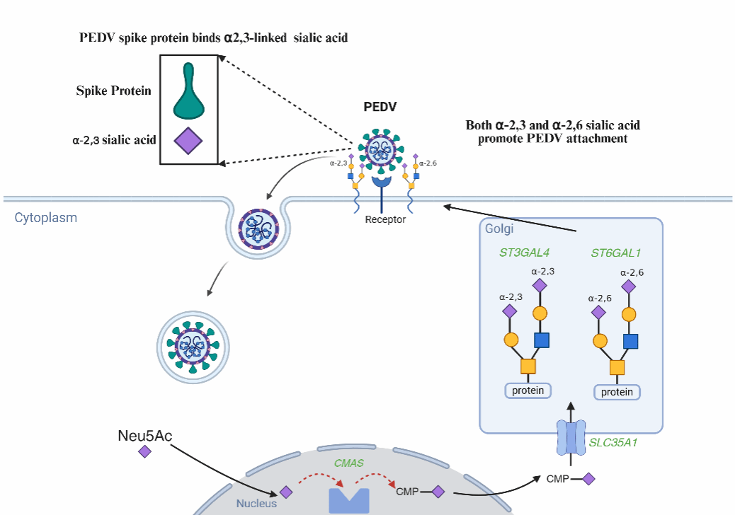 图1.PEDV利用唾液酸作为附着因子促进其入侵