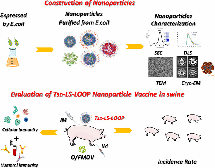 口蹄疫(FMD)由口蹄疫病毒(FMDV)引起,是全球畜牧业领域危害最严重的动物疫病之一,具有高度传染性与经济破坏性,可感染牛、猪等多种家畜及野生偶蹄类动物,不仅导致患病动物生产力显著下降,更会造成幼畜高死亡率,对畜牧业可持续发展构成重大威胁。已有研究证实,FMDV 的 VP1-G-H-loop表位是关键的线性 B 细胞中和表位,可有效诱导机体产生高滴度中和抗体,为抵御病毒感染提供核心体液免疫保护;而 CD4+T 细胞表位 则能通过调控免疫细胞功能—包括促进淋巴细胞增殖、诱导IFN-γ 分泌、激活巨噬细胞杀伤活性及增强抗原呈递细胞的MHC 分子表达,二者共同构成 FMDV 的核心免疫优势表位,是疫苗研发的关键靶点。在疫苗递送载体领域,纳米颗粒支架因兼具优异生物相容性、良好热稳定性及精准分子特异性,已成为提升抗原递送效率与免疫应答效果的优选载体。