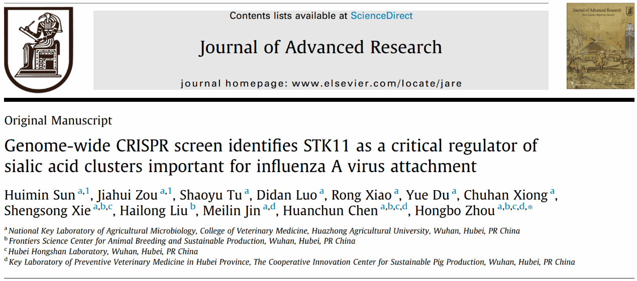 南湖新闻网讯(通讯员 孙慧敏)近日,公司农业微生物资源发掘与利用全国重点实验室、动物育种与健康养殖前沿科学中心、湖北洪山实验室、bevictor伟德周红波教授团队在流感病毒与宿主相互作用机制研究中取得重要进展。相关研究成果以 “Genome-wide CRISPR screen identifies STK11 as a critical regulator of sialic acid clusters important for influenza A virus attachment”为题在Journal of Advanced Research期刊上发表。