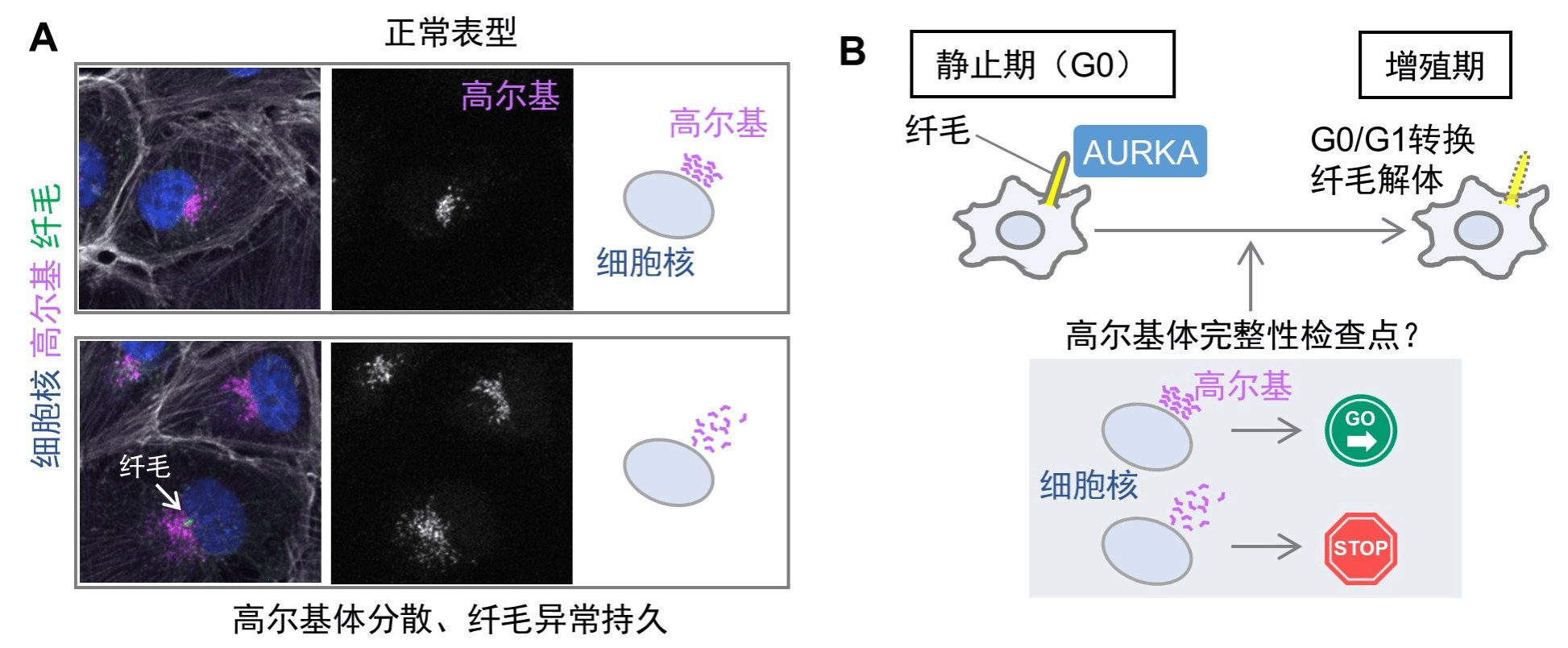 应用该方法,研究团队系统分析了哺乳动物细胞在增殖与分化命运选择过程中细胞结构的动态变化及其调控机制。研究特别关注在静止期(G0期)形成、能感受细胞外信号并深度参与命运决定的纤毛,以及与纤毛功能密切相关的高尔基体结构动态。结果显示,在静止期向增殖期转换(G0/G1转换)受阻的条件下,原本应解体的纤毛异常保留,同时高尔基体出现分散的现象,表明这些细胞内结构的形态变化是影响细胞周期顺利推进的关键因素(图2A)。进一步研究显示,细胞周期调控因子Aurora kinase A(AURKA)参与了上述结构动态的调控。基于这些发现,研究团队提出了一个新的细胞周期检查点模型,认为高尔基体与纤毛的结构动态可能作为主动调控细胞周期的时序性的重要节点,参与细胞功能的精细调控(图2B)。