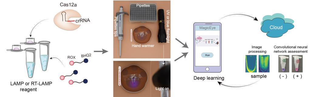 南湖新闻网讯(通讯员 谢胜松,陶大刚)近日,赵书红教授团队建立了基于CRISPR/Cas12系统介导的核酸裸眼可视化检测新技术,结合卷积神经网络算法开发了一个能提高检测灵敏度和智能化结果判读的手机APP软件,可方便实现现场化高灵敏高特异核酸分子诊断。