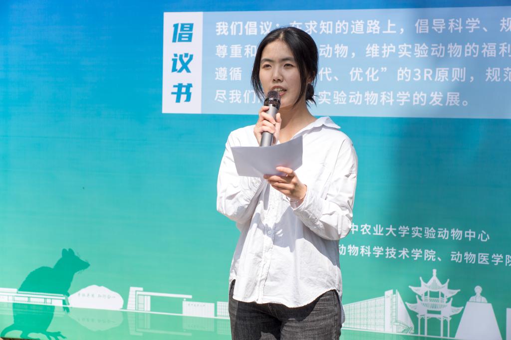 活动最后,动科2204班熊明慧宣读倡议书,她号召大家“在求职的道路上,倡导科学、规范地开展动物实验;尊重和善待实验动物,维护实验动物的福利;遵循‘减少、替代、优化’的3R原则,规范合理地使用实验动物,尽我们所能推动实验动物的科学发展。”之后,全体人员面向纪念石鞠躬默哀并献花。