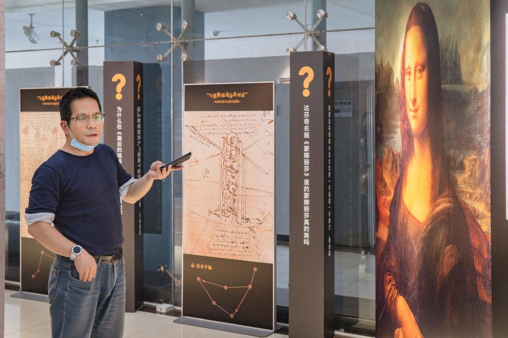 图书馆展厅内,师生们相继驻足于张衡与达芬奇的种种发明创造和艺术作品的介绍前。达芬奇的绘画作品《蒙娜丽莎的微笑》、水力永动机的设计手稿、直升机的缩小模型,张衡的文学作品《西京赋》、地动仪、指南车等展品,让师生沉浸式地感受到科学与艺术的交融。