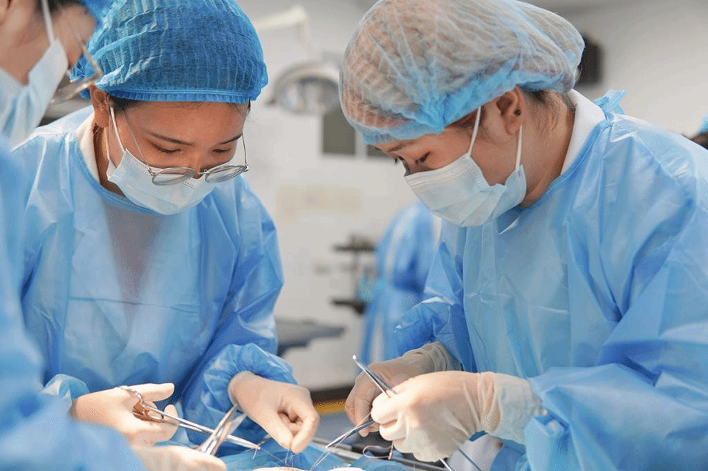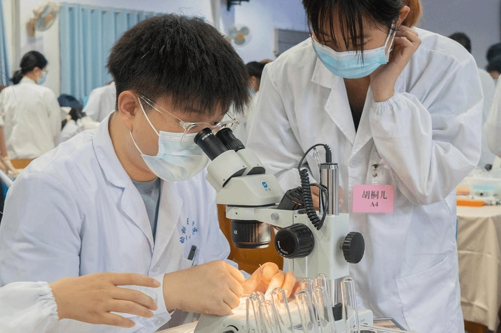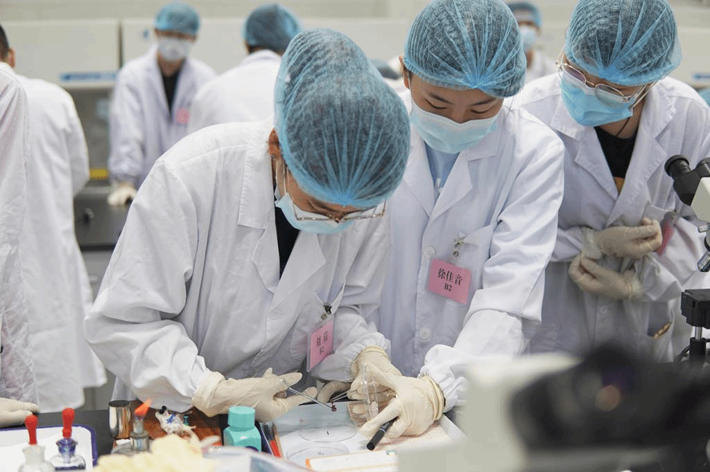 同学们专心进行外科手术实验操作