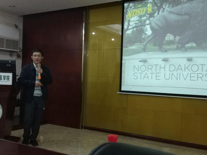在介绍北达科他州立大学之前,宋云峰老师对留学准备做了一个系统的总结分析,包括美国签证的种类、功能、办理,出国前需要掌握的生 活技能——理发、下厨等,英语口语的锻炼。然后宋老师为大家介绍了该校的“吉祥物”——勇猛、倔强的野牛,丰富的校园文化——“NCAA”各项赛事,独特的建筑风格——“趴着的”大楼等。在谈到访学体会时,宋云峰老师讲述了许多具有代表性的故事经历,比如“三把钥匙能打开整个实验室所有大门”的故事展现了高度的合作、共享精神,“环卫工人严格执行垃圾分区”、“消防报警器的整体串联”等体现了全面的安全责任意识。并就自己的亲身经历告诫大家需要严格遵守各项法规,尊重他人隐私,保护自身良好形象和信誉。最后,宋云峰老师希望大家能发散思维,加强合作,敢于创新。