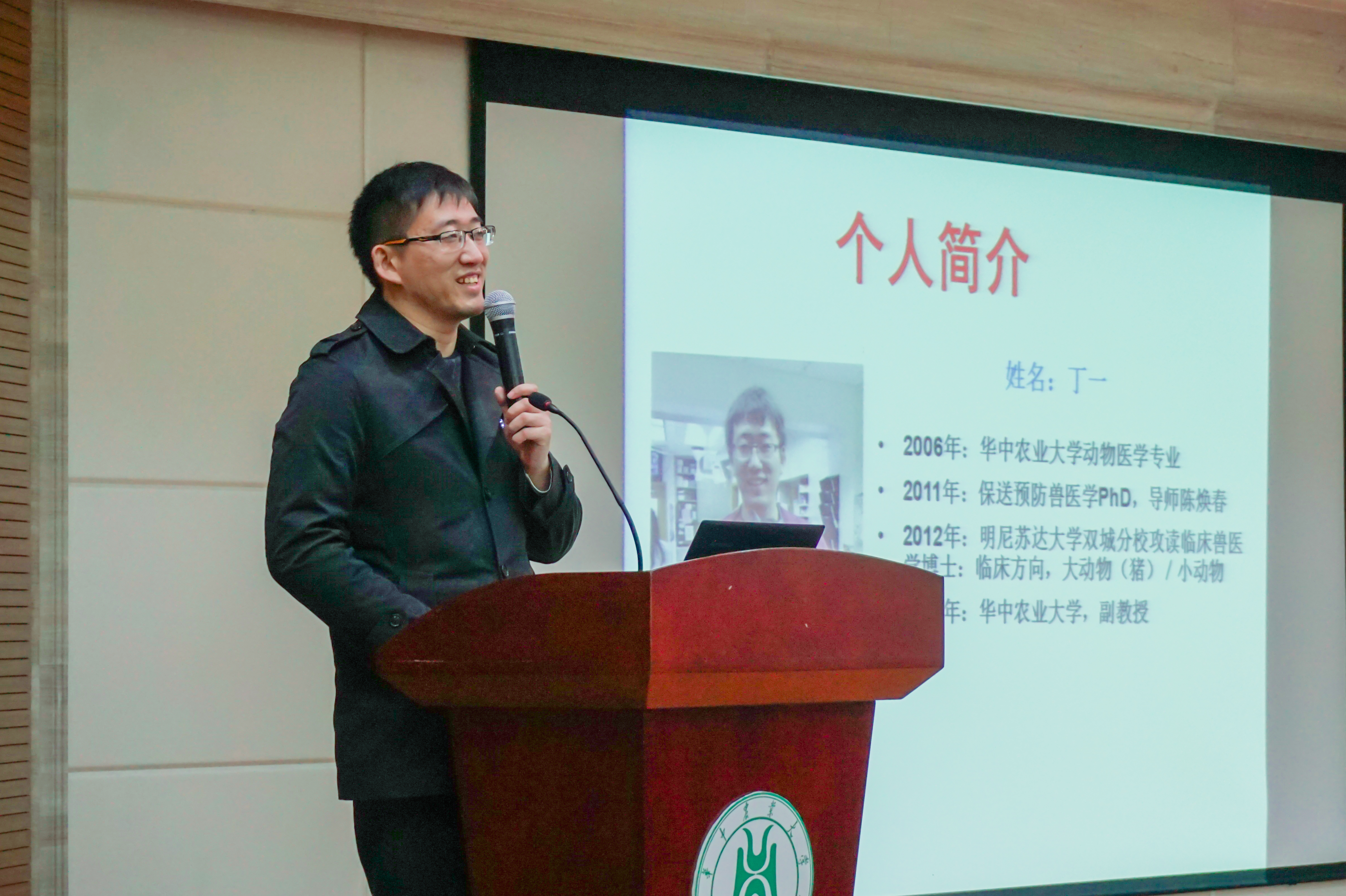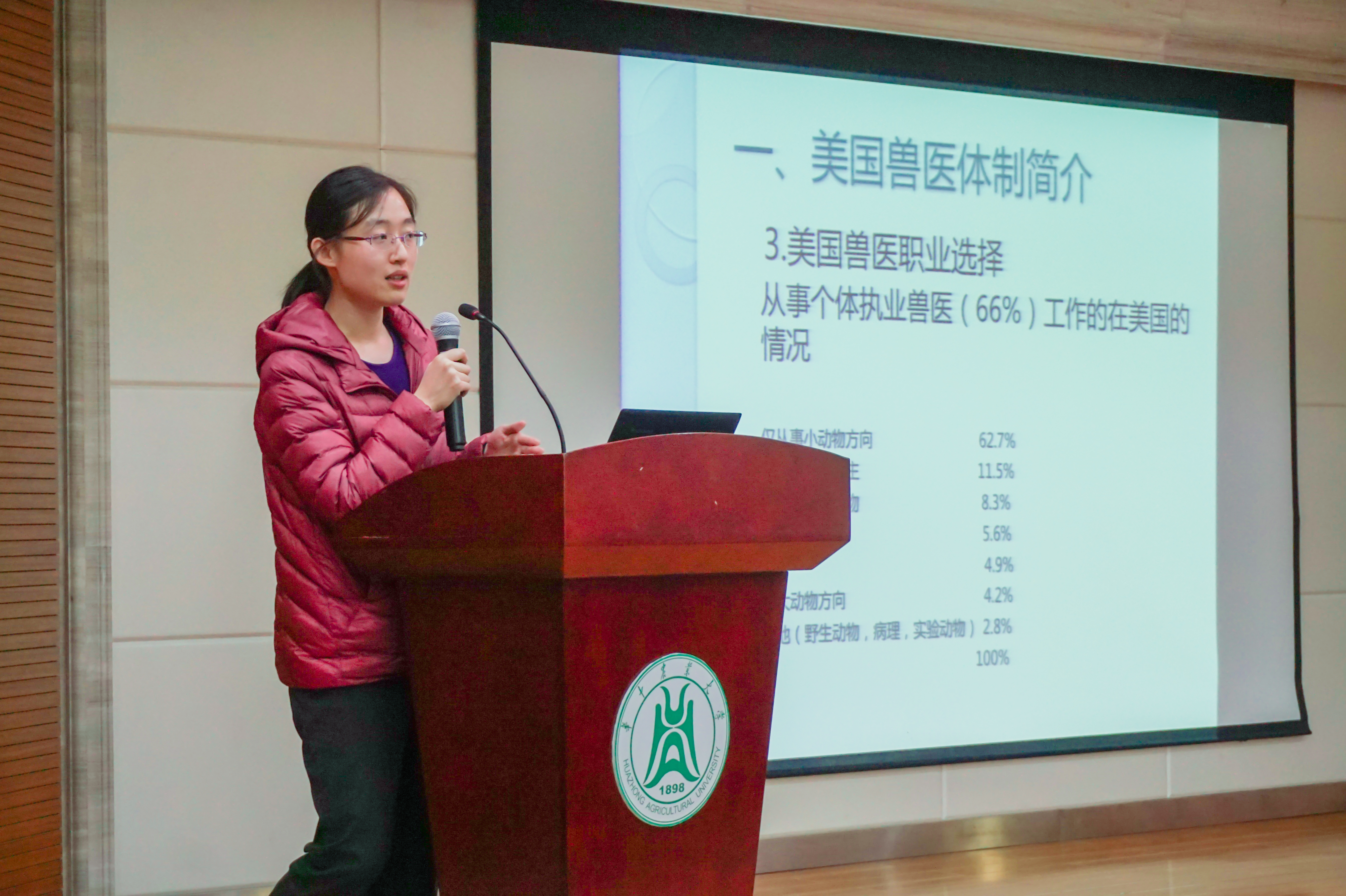 沈瑶琴围绕美国兽医体制简介、美中动物卫生中心项目、堪萨斯州立大学求学经历三大方面展开宣讲。沈瑶琴指出,在美国兽医专业的录取要求很严格并且之后的淘汰率也很高,但仍是有志老员工的良好选择;她同时也说到非兽医专业的员工只要学习了基础必修课程并达到相关要求也可以来修习DVM;此外,她还突出强调了沟通、合作的重要性,并鼓励我们多参加活动丰富自身的经历。