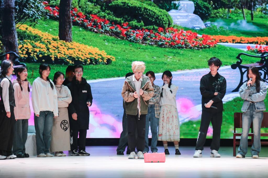 “灵感来得非常突然,整个剧本从主题到大纲确定只用了半个小时。我们通过对日常生活中普遍现象的观察和思考敲定下来本次剧本的初步走向。”编剧组组长熊明慧谈道。紧扣“服美役”一主题,思维不断发散延伸,从杀马特到瘦身束腰,再到增高垫,所有的灵感都来自生活经验。整场表演用夸张的剧情和舞台表现展现出小帅从盲目追随他人、到最终找回自我、悦纳自我的过程。主角小帅是平常生活中的我们,小美则代表着大众视角中时尚的风向标,群演同学是紧跟潮流的大众。“一定要为了大众的审美而不断改变自己吗,‘我’到底是谁?”剧本通过小帅与小美及群演间的鲜明对比与戏剧冲突,展现出对于坚持自我与追随大众之间的摇摆与思考。