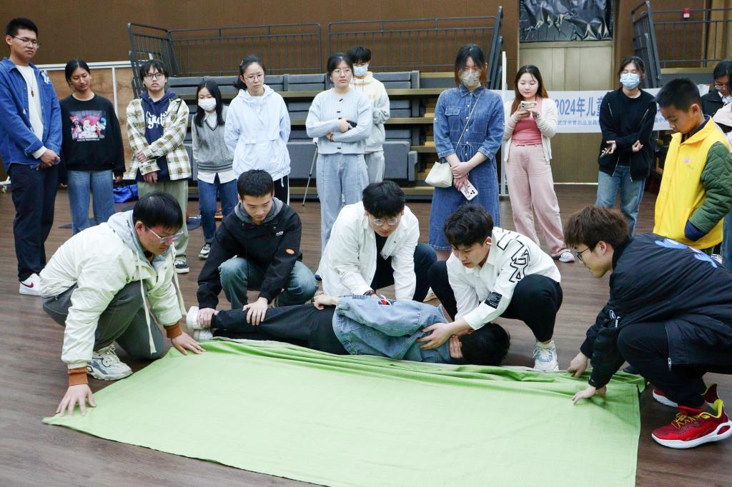 在“毛毯担架计时赛”展示环节,服务队队员万峥嵘主动扮演受伤者,在小组其他成员的帮助下成功“获救”。谈及感受,他说自己被“毛毯担架”抬起时心里不免紧张,但看到组员们配合默契、举止谨慎也便放下心来。他认为,伤者与救助方相互信任也是紧急救援过程中极为重要的一环。