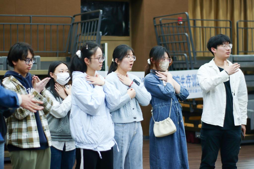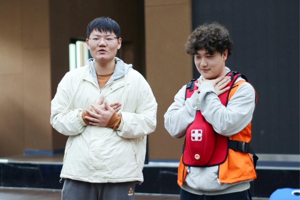 “一手‘剪刀’两指并拢放在肚脐上方,另一手‘拳头’拳眼在放在两指上方,剪刀手以‘布’的形状包住‘拳头’,快速向后上方冲击5次......”青志学员杨傲宇佩戴教具,向大家展示着刚学会的腹部冲击法。