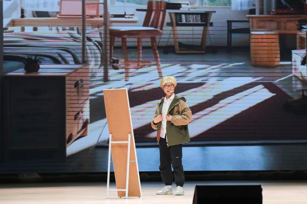 故事紧扣“服美役”一主题,以“小帅”“小美”为主角将情节逐步串联,从杀马特到瘦身束腰,再到增高垫。整场表演用夸张的剧情和舞台表现展现出小帅从盲目追随他人、到最终找回自我、悦纳自我的过程。主角小帅代表着平常生活中被大众审美所裹挟的群体,小美则代表着大众视角中时尚的风向标,群演同学代表紧跟潮流的大众。故事在小帅对自己究竟是谁的不断摇摆与追问中,在主演之间戏剧冲突逐渐升级之中,引发观众自身对于自我价值追求的思考与讨论。