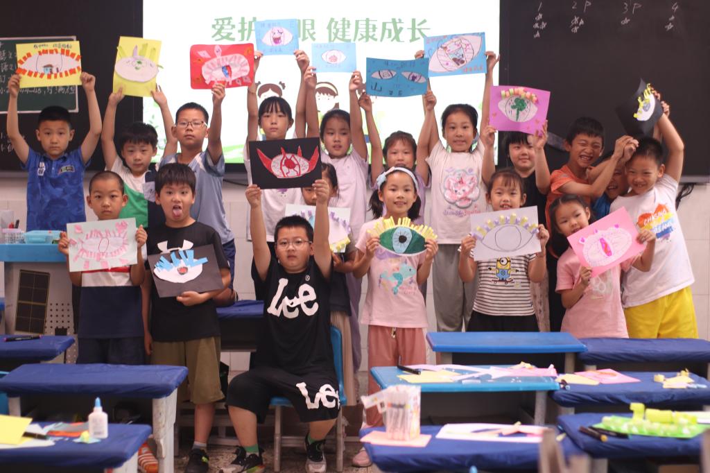 课程临近结束,志愿者与同学们举起作品,一起留下了珍贵的合影。通过本次科普课堂,不仅增强了公司中员工的爱眼意识,也为更多青少年儿童科普了正确的用眼方式,为他们形成正确的用眼行为打下坚实基础。