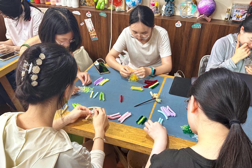 实践团队们联系到南京云青艺雨手工工作室,在王进老师的指导和帮助下开始了绒花发簪的制作。王进首先为团队成员讲解制作要点。她将簪子比作树干,成员们之后要做的是树上的“花朵”和“叶子”。“树干”是一定的,而“花朵”和“叶子”的大小、颜色、生长位置等都是由制作者选择的。王进这一番话向团队成员传达出手工作品“由心而生”的理念。听过简单讲解后,成员们开始上手操作,主要完成的是打花与包装两个步骤。大家在工作室内舒缓的音乐中静下心来,沉浸在抽绒、缠线、组装各个步骤中,碰到较难操作的地方主动向老师求教,场面一派和谐。