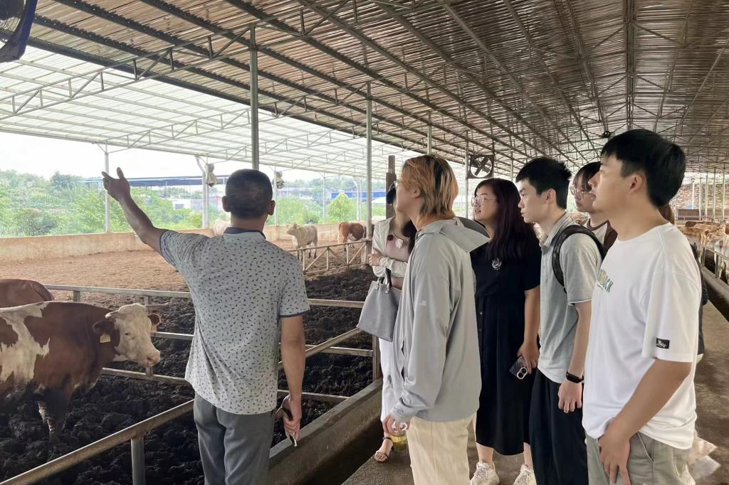 调研过程中,王良权介绍道:“使用‘床场一体化’这种养殖技术后养殖场的牛生病的少了,而且在养殖场中基本上没有臭味了”。随后,实践小组对肉牛养殖的饲料和肉牛养殖场的设施建设展开调查。该肉牛养殖场的饲料以玉米、青贮料和秸秆为主,在犊牛的饲料中会添加一定的精料补充剂,养殖场的食槽与水槽分离,并配备湿帘对养殖场进行降温。调研结束后,李艳表示,畜牧生产不应成为环境的负担,我们将积极引导畜牧企业踏上绿色产业的征程,共同打造生态环保的生产新业态。