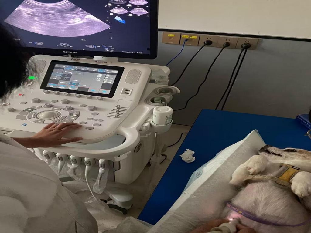 社会实践第一天,医院便迎来了一位特殊的病人,一只名为“球球”的小狗由于食欲不振,排泄不规律且伴有呕吐现象前来就医。坐诊医生许明在对病患进行触诊后发现,“球球”的腹部有明显膨大,且体温偏高,于是便对“球球”进行了进一步的超声检查。在对影像进行分析后,许明最终将其诊断为子宫蓄脓所致,并对“球球”进行了手术治疗。术后,许明提到:影像技术对最终病灶的确定起到了至关重要的作用,医学技术在不断地发展变化,一名合格的宠物医生必须与时俱进,充分利用现有科技对病患进行最有效的治疗。