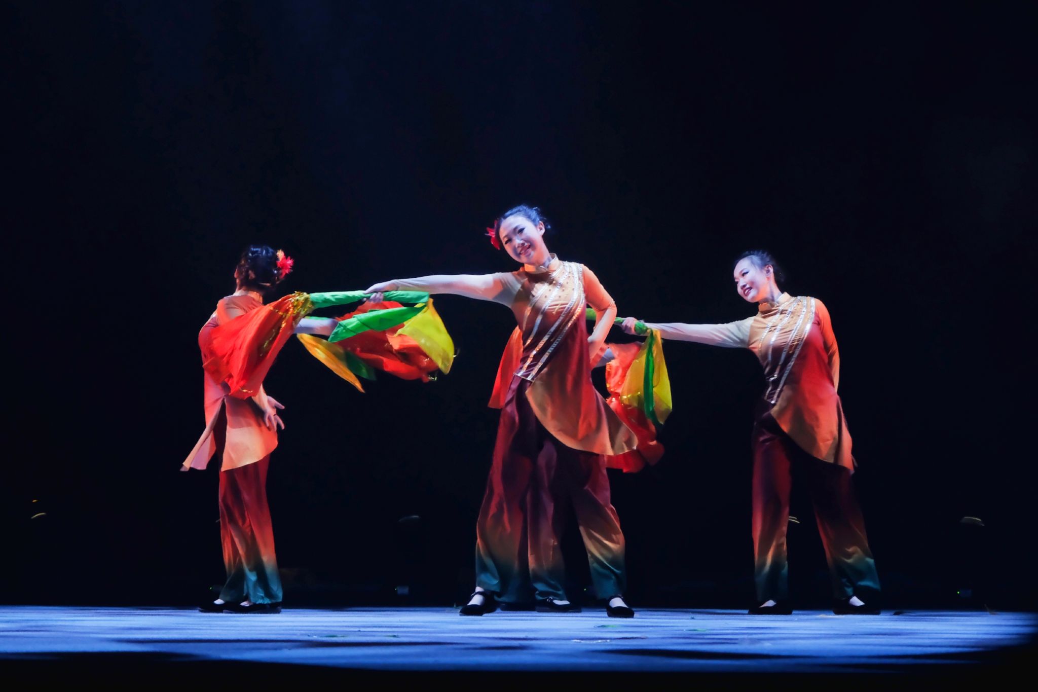 《秋熟》由动科动医舞蹈团的17名女生共同演绎,描绘出一幅秋收打麦的民间丰收图。秋风送爽,麦穗金黄,秋熟之景,尽收眼底;舞动田间,喜悦盈怀,收获之歌,响彻云霄。演员们身着金黄色的舞蹈服饰,仿佛麦浪于秋风中翩翩起舞,她们时而弯腰劳作,时而跳跃欢呼,步伐刚健,节奏鲜明,踏脚击手,情绪昂扬。舞蹈以秋收为背景,通过丰富的肢体语言结合莲湘、扇子等道具,生动展现了农民们辛勤劳作、收获果实的喜悦与满足。舞台上,灯光与音乐完美融合,氛围温馨而充满希望,观众仿佛置身于广袤麦田之中,感受大自然的壮美与和谐。