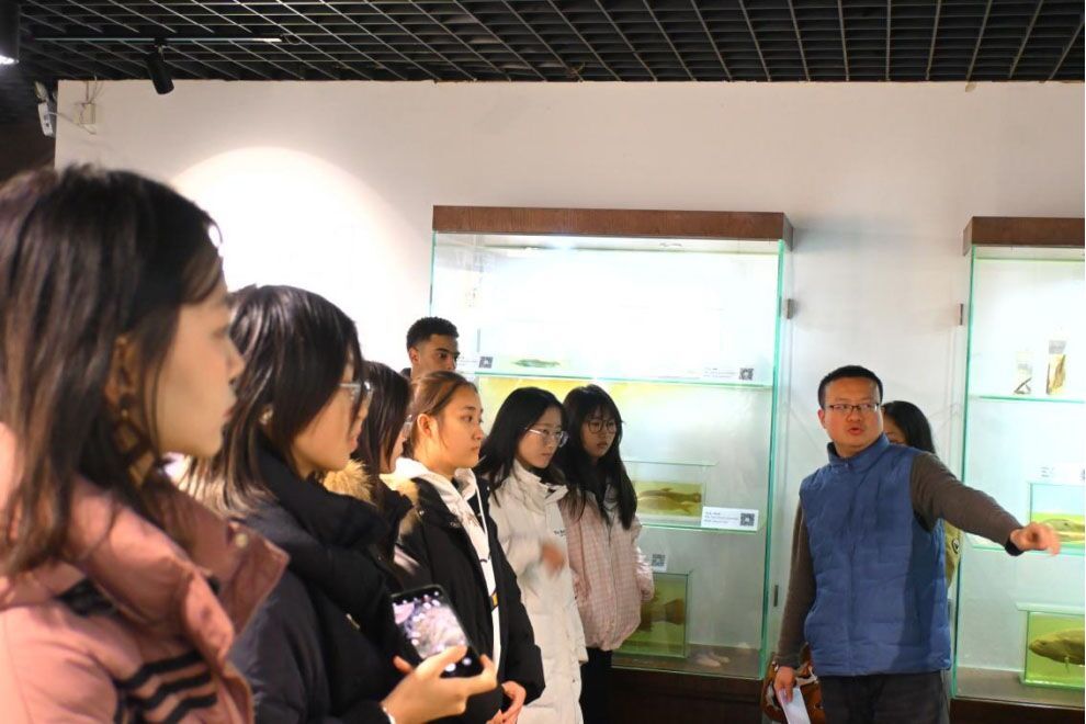 水生生物博物馆工作人员王熙引领全体成员参观了博物馆主厅,并详细介绍了馆内的主要藏品,如矛尾鱼标本、白鲟标本、白鱀豚标本、江豚标本及其骨骼等。随后,同学们参观了水产抗逆与病害防控相关实验室,以及阳台的鱼类养殖设施。在水生所科技基础能力处处长黄丹老师的带领下,师生们共同参观了中国科公司水生生物研究所所史馆,深入了解了该所的历史。