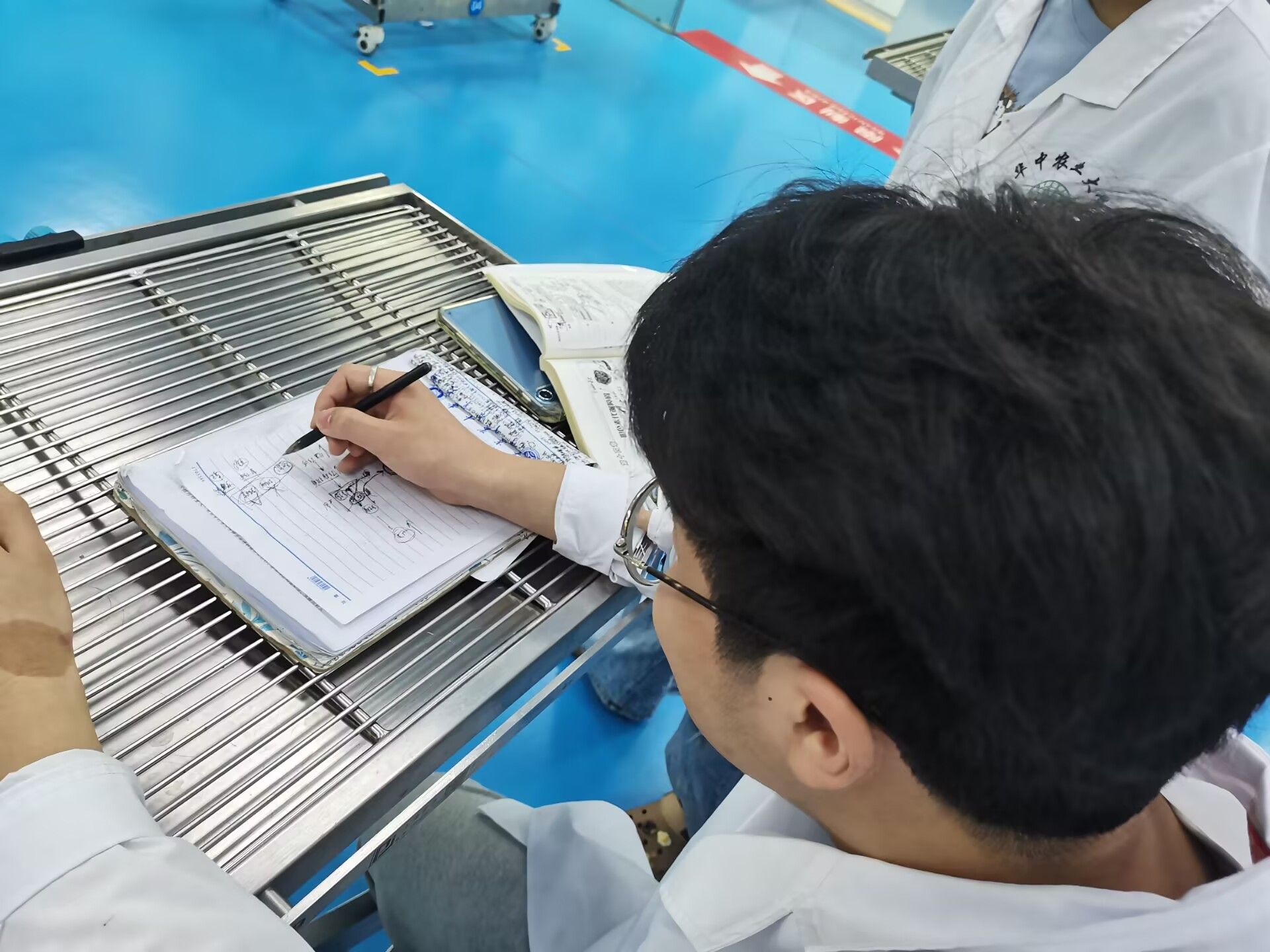 7月1日的训练中,三位指导老师指出初期训练中无菌操作不规范、主刀与助手配合欠佳、麻醉助手术中监护不到位等问题。刘东明老师强调:“知不足,才能自反进步,需要先吃透评分标准再进行练习。”经多种不同配合方式的尝试与磨合,队员们秉持各扬所长的原则,确定最佳实操阵容,实操技能显著提升:徒手打结速度从30秒20个提升至40个,血涂片制备达规范标准,能够丝滑推出漂亮透明的羽状尾,使视野中的细胞疏密得当。