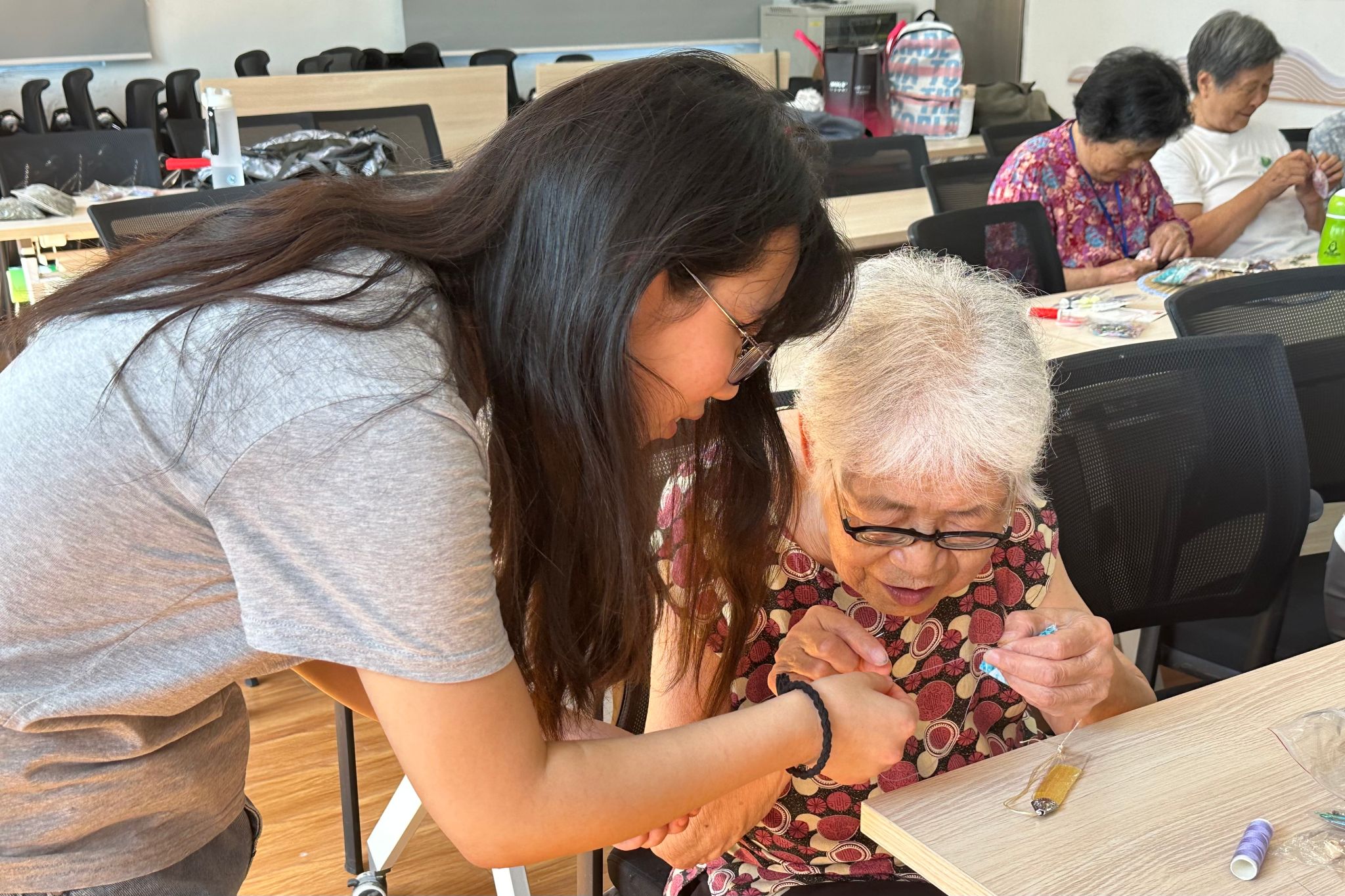 活动现场,实践团成员陈昱萱以中医养生为主题,详细讲解了足三里、风池穴等穴位的功效。她通过现场示范,鼓励老人们尝试自行按摩穴位,掌握按摩技巧。进入香囊制作环节,现场气氛变得温馨融洽。面对部分老人视力不佳、对制作步骤不熟悉等问题,志愿者们主动帮忙穿针引线,并手把手进行指导。一位奶奶笑谈道:“这香囊真好看,孩子们教得真仔细!我还想带些材料回去,给我小孙子也做几个。”