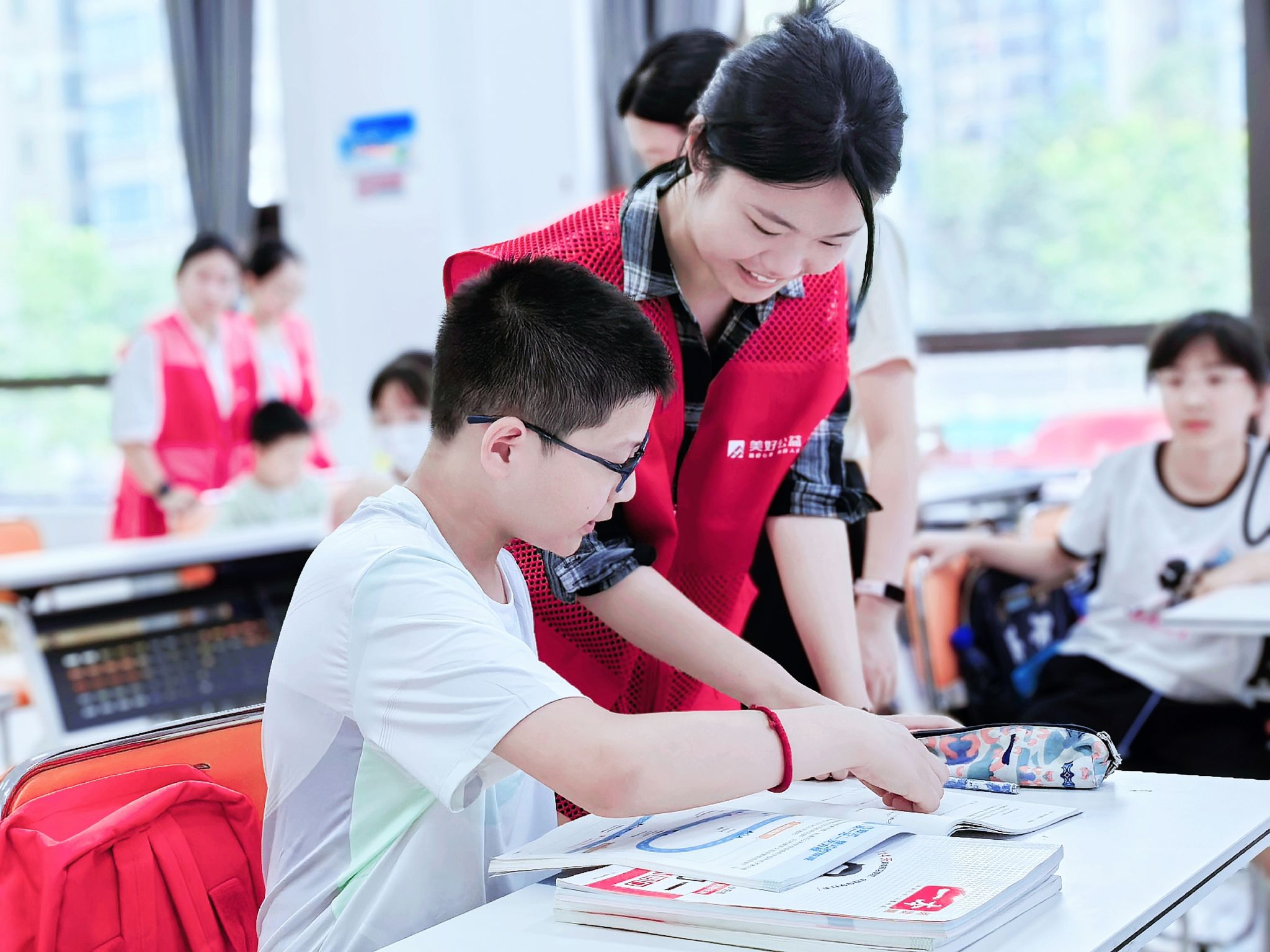作业辅导环节采用“分层指导”模式,凸显专业团队的教学优势。针对低年级员工,实践队成员蒋情薇采用“图文结合”方式讲解生字词;面对小升初衔接阶段的孩子,实践队成员陈梦伊和彭晓愉则侧重逻辑思维培养。彭晓愉在辅导中,用动物生长周期类比代数式变量关系,将专业知识融入教学创新。