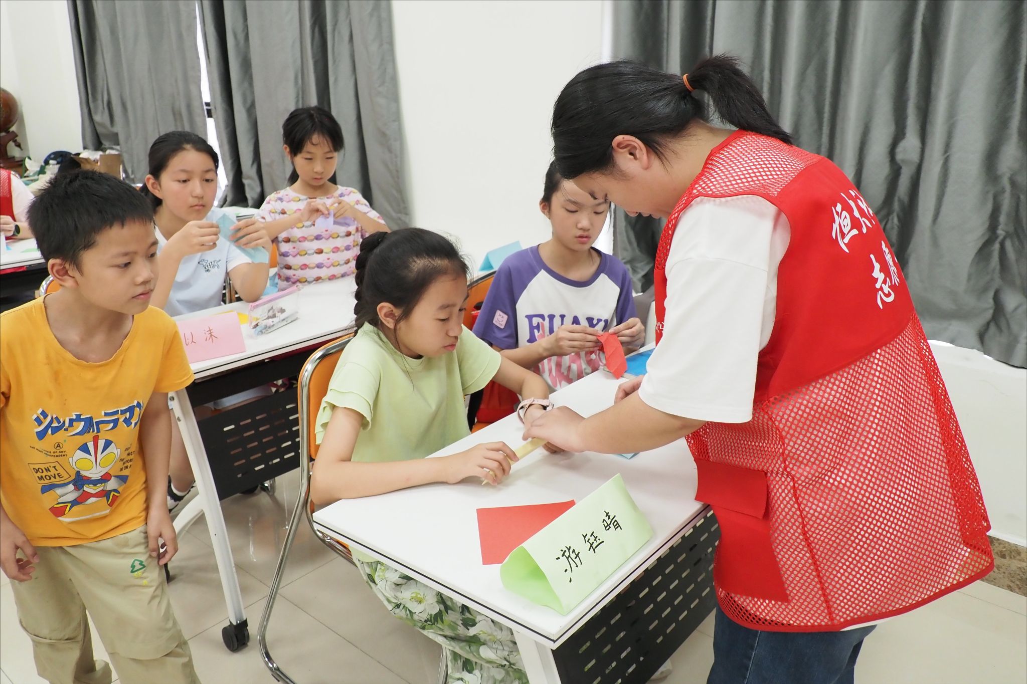 当日下午,实践团成员郭鸿洋、彭晓愉牵头开展创意折纸工作坊,与团队成员共同教授托管班儿童制作“弹力蛇”“玫瑰”等折纸作品,鼓励孩子们将成品赠予亲友,助力培养其情感表达与社交能力。在队员指导下,孩子们边思考边操作,按步骤将彩纸折成目标形状。因“弹力蛇”折法步骤多、难度大,不少孩子向队员求助完善作品。三年级员工游同学表示:“弹力蛇很难做,在赵紫晴姐姐帮助下完成后,特别有成就感。”