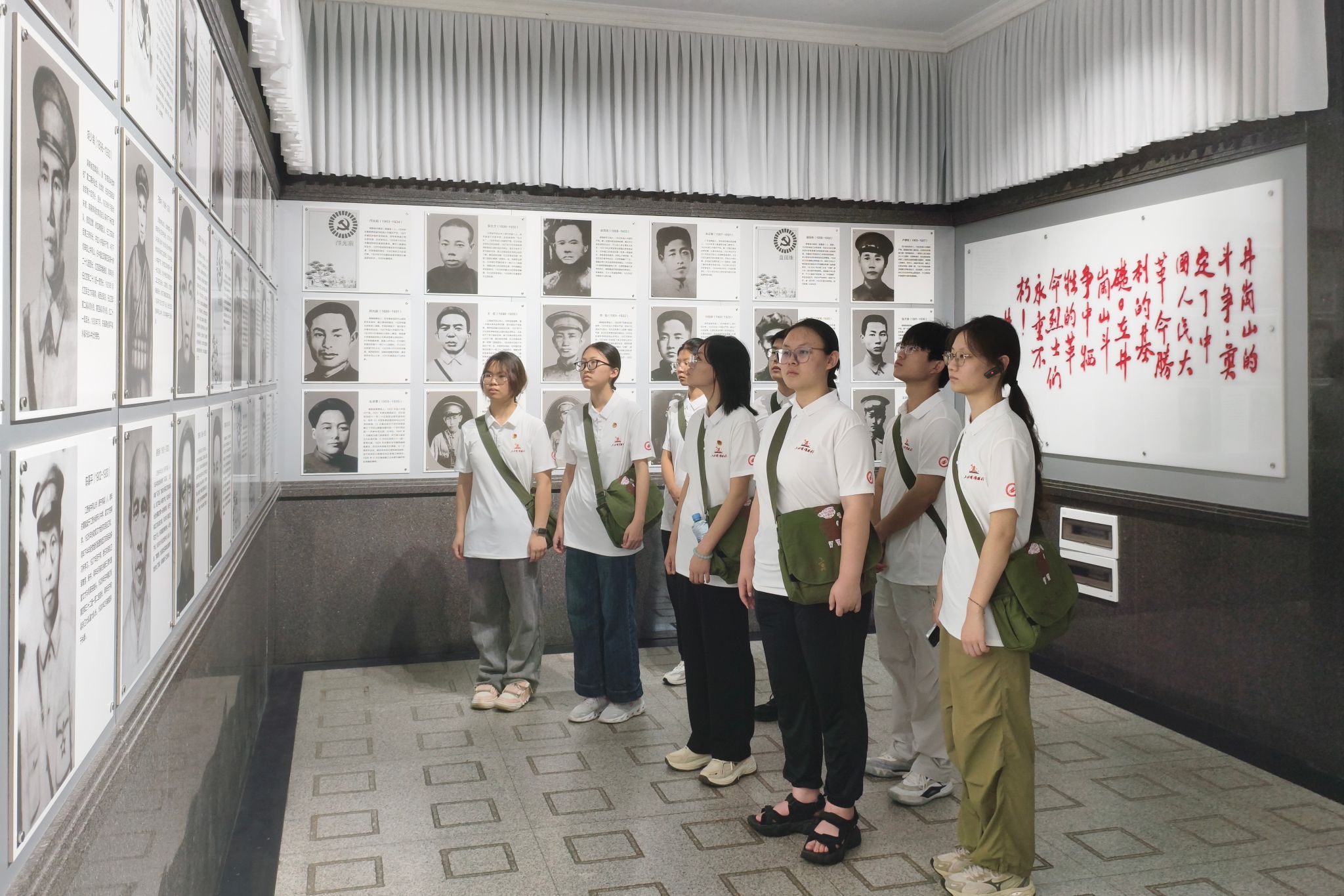 怀着沉痛的心情,队员们列队整齐,神情庄重,缓步迈上台阶走向烈士纪念堂。肃穆的氛围中,队员们敬献花圈后全体肃立,向为国家独立、民族解放和人民幸福英勇献身的革命先烈们默哀致敬,表达深切缅怀与崇高敬意。随后,队员们依次瞻仰105位井冈山斗争先烈的纪念标识,同步了解当年井冈山革命根据地周边7个县市15744位烈士的名录信息。还有许许多多没有留下姓名的英雄,纪念堂特为他们立了一块无名纪念碑。面对无名英雄碑,队员们默默伫立,向那些为革命事业献出宝贵生命的无名英雄致以最崇高的敬意。
