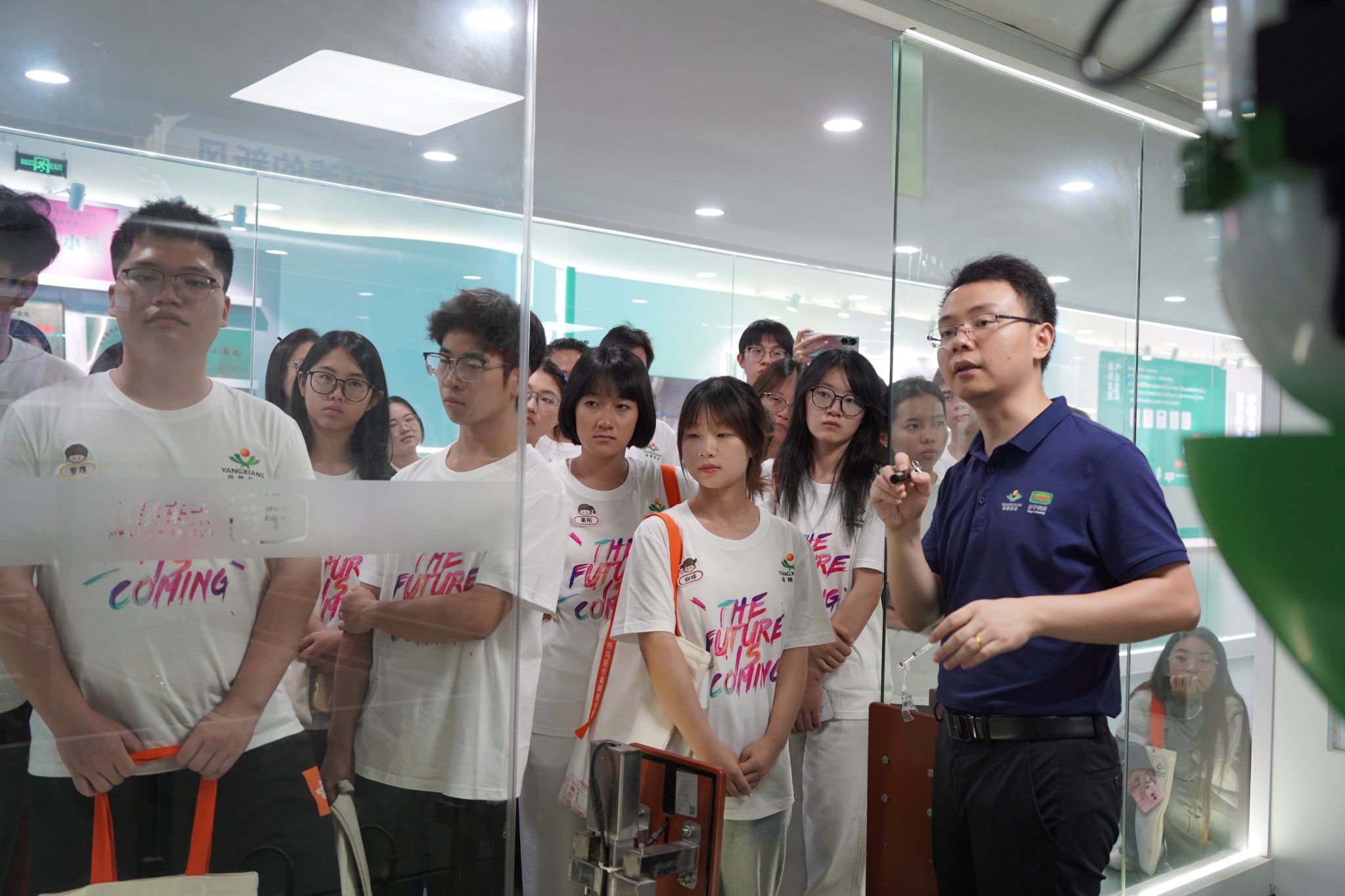 随后,龙伟坚沿着整个智能养猪流程,向实践团队成员们逐一介绍了扬翔股份自主研发的一系列智能养猪设备,包括查情宝、精喂仪、智能冷暖板、产房母猪精准饲喂三件套、测定站、肉猪智能分栏设备等。从借助天选基因库为母猪精准受精,到通过余料宝、余水宝等智能产品实现精细化喂养管理,每一项技术应用都让团队成员眼前一亮,深刻感受到科技为传统养猪业带来的颠覆性变革。紧接着,扬翔人力资源部副经理莫霜露带领团队成员重点学习校企合作研发的“秀博基因”猪精项目,相关研发产品目前已涵盖多个品系,能够满足不同猪场的多样化需求。