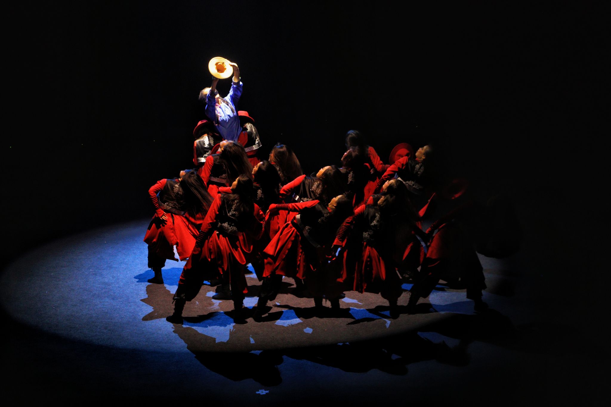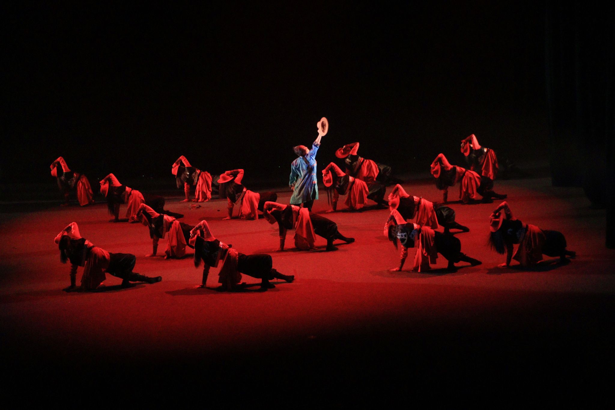 灯光下,银发老人双臂如苍鹰展翅般奋力舒展,身躯匍匐于大地,灵魂却奔向故土的光。群舞少女们昂首阔步,随热烈激昂的音乐将舞台化作沸腾的红色海洋。每一处肩部的抖动都带着穿透岁月的力量,每一次整齐划一的跺脚都似在叩击大地,诉说对生命的热爱与执着。当老人的身躯与年轻的幻影共舞,这不仅是与自我的和解,更是生命火种在岁月中的必然交替与永恒传承。演员们以此舞诠释:年华逝去,魂灵永存;生生不息,一如草原。