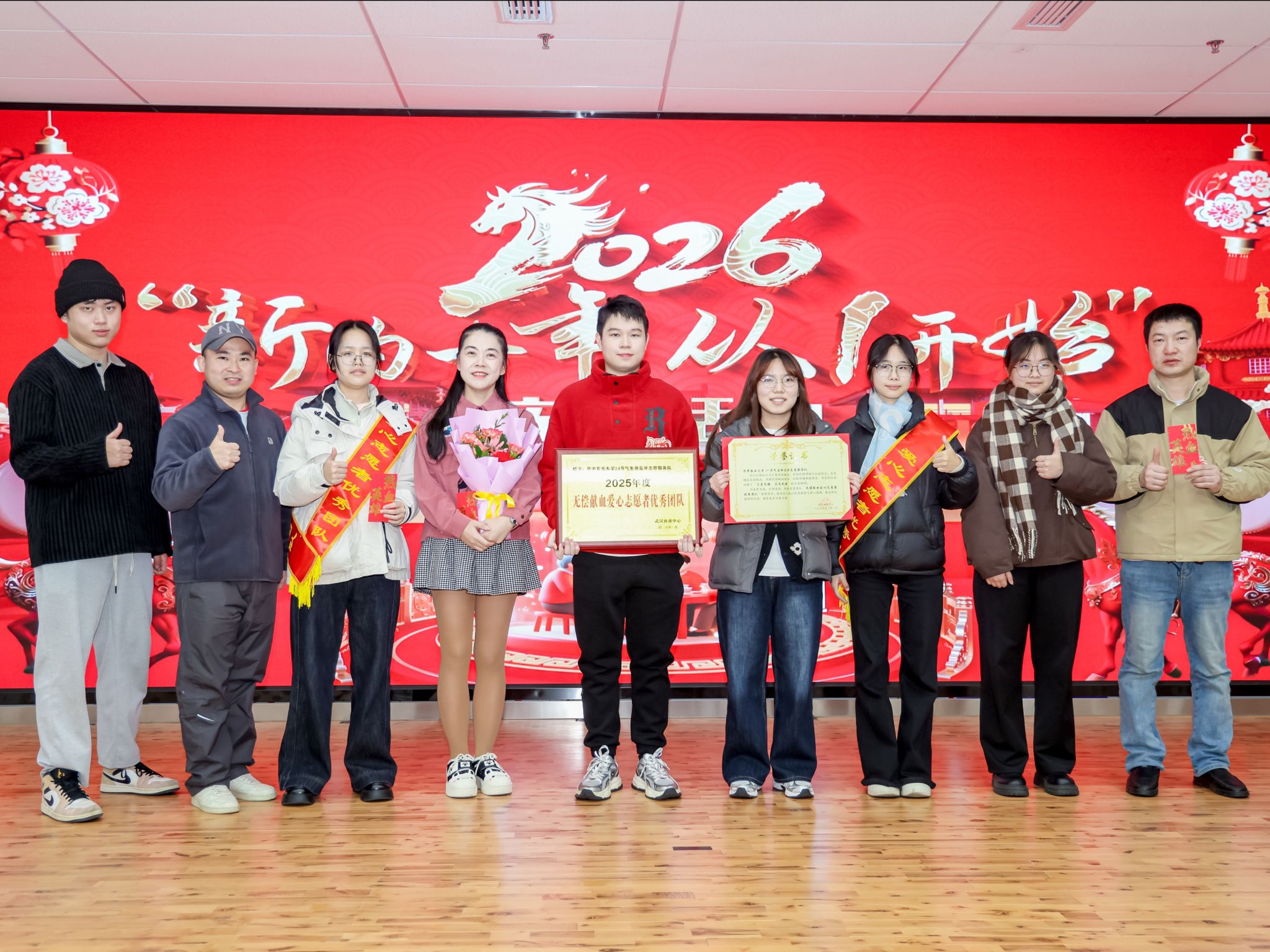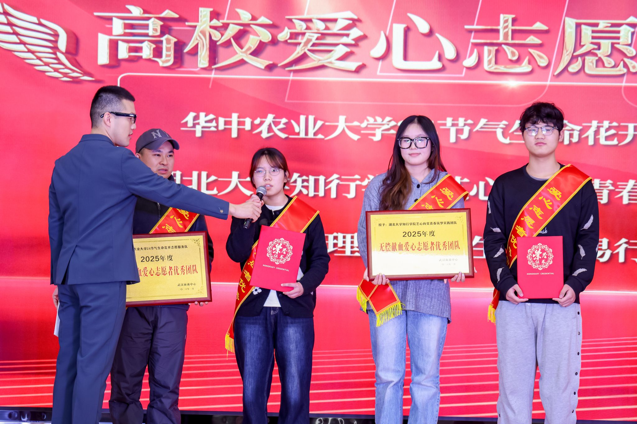 随后进入颁奖环节,大会对2025年度在无偿献血工作中表现突出的集体与个人予以表彰。其中,公司由红十字会、牧医阳光志愿服务队、生物技术本科生第二党支部共同组建的“二十四节气生命花开”志愿服务团队凭借在无偿献血组织动员、科普宣传及志愿服务中的持续付出,荣获“武汉市无偿献血高校爱心志愿者团队”称号。此外,大会依次表彰了爱心家庭、热血传递优秀个人、新晋200次献血者以及“荣退”的献血者等群体。