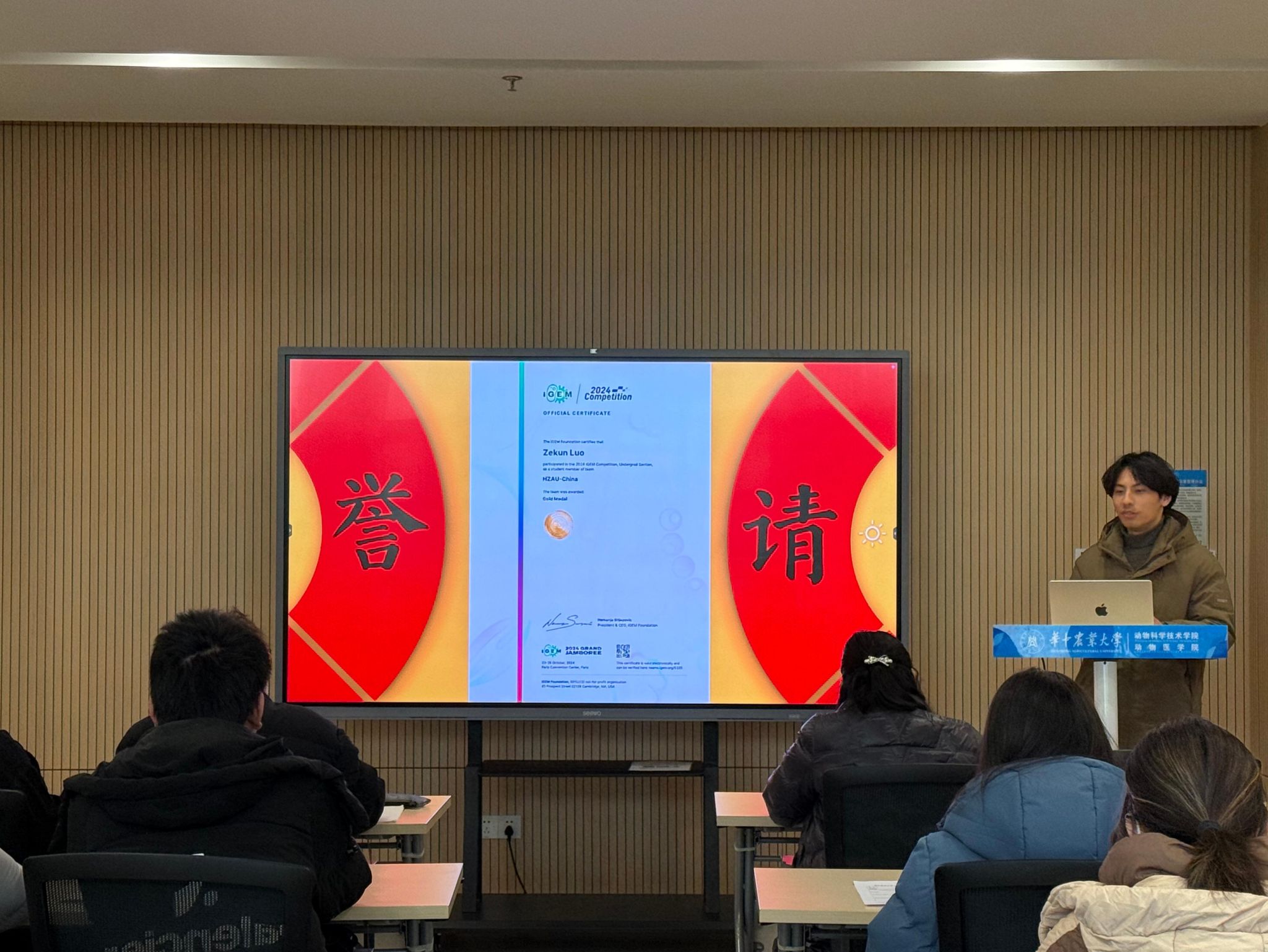 交流会上,班级2025年度成果集中呈现。在刘华珍老师指导下,动医2204班在学业、竞赛、社会实践等领域累计获得52项集体与个人荣誉。学业方面,班级四级通过率达96.97%,四级最高分585分、六级最高分554分;竞赛领域,张可欣团队获全球商业精英品牌策划大赛国家级一等奖,许心怡团队获中国国际老员工创业创新大赛2025湖北省金奖,罗泽坤团队摘得2024 iGEM本科生组金牌。一系列成果展现了班级在专业实践与科研创新方面的实力。