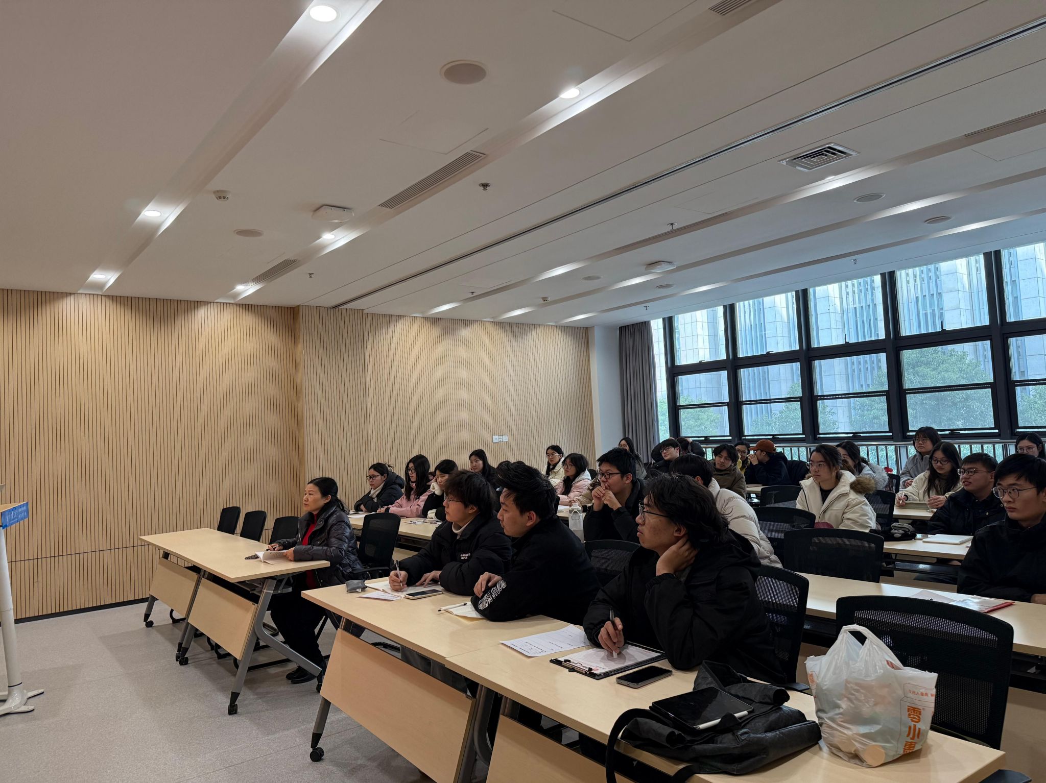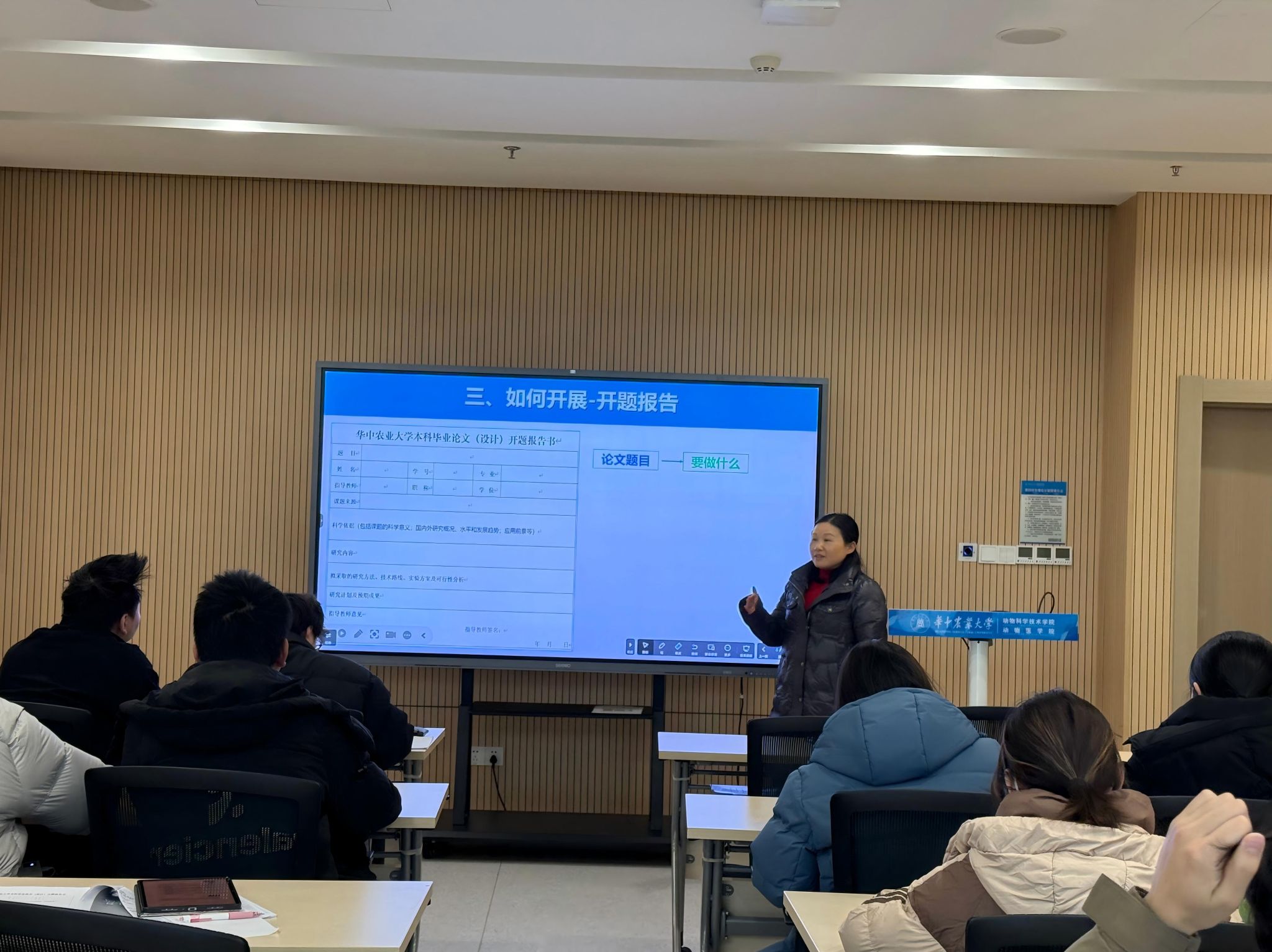 随后,刘华珍老师在总结讲话中肯定了同学们2025年的成长进步,提出“每个人在自身基础上取得进步就是成功”的育人理念,鼓励同学们理性看待焦虑,以清晰规划推动成长。针对毕业学年核心任务,她结合指导经验,指出同学们在毕业论文中普遍存在的选题滞后、认知不足、方法困惑三大问题,并给出具体解决方案:要求同学们主动对接导师确定选题,利用寒假完成文献查阅、开题报告核心内容撰写及外文翻译工作,为后续研究筑牢基础。同时,她拆解了毕业论文逻辑架构,从科学意义、研究进展、目的意义三方面阐释“为什么做”,从研究内容、方法、技术路线明确“如何做”,并结合案例强调实验记录规范与论文写作格式的重要性,提出以毕业论文撰写为契机,锤炼文献查阅、实践操作、写作表达、成果汇报等综合能力。此外,刘华珍老师结合“四个面向”原则,解读选题核心方向,鼓励同学们将个人研究与国家重大需求相结合,在服务行业发展与国家建设中实现个人价值。