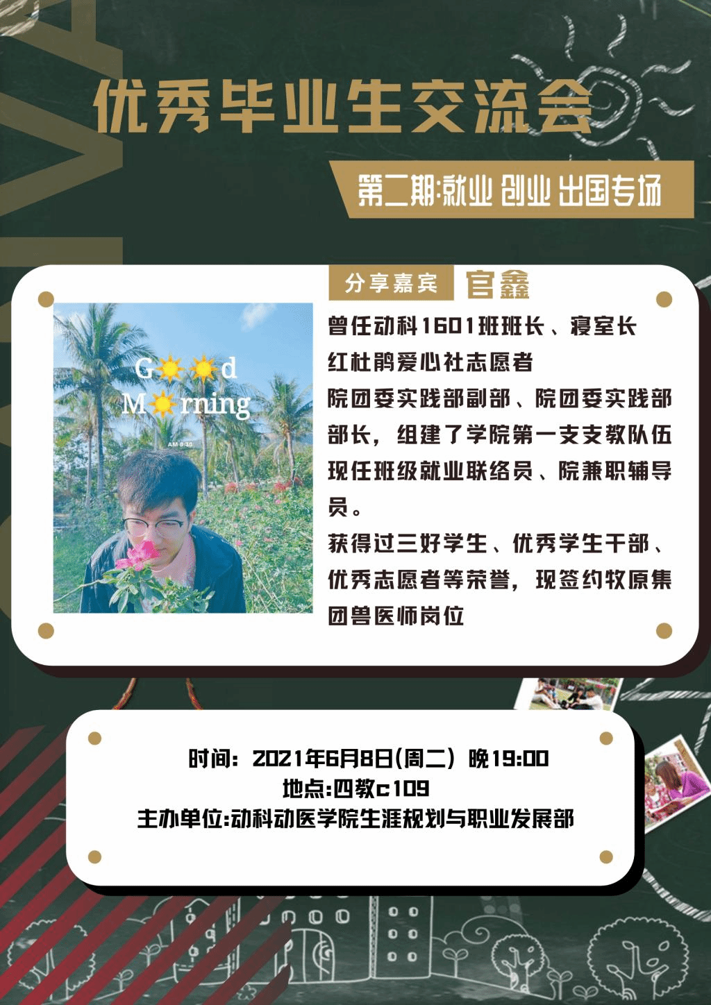 六月四日与六月八日晚上七点将分别在四教C110、C109举办优秀毕业生交流会两个专场,第一个专场为考研、保研专场,第二个专场为就业、创业、出国专场,我们有幸请到杨思齐、翟明丽、匡磊、葛曲、郭明月、官鑫六位学长学姐进行交流分享。本活动旨在引导同学们学习借鉴在各方面取得优异成绩的优秀毕业生的经验和方法,从而为自己的大学阶段发展设定更细致可行的规划,并促使大家能脚踏实地完成自己的规划,为未来人生发展奠定基础。