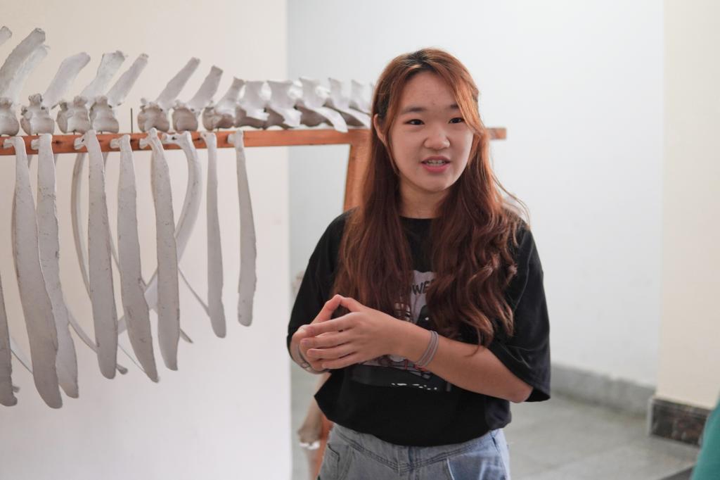“牛有13枚胸椎,6枚腰椎,5枚荐椎以及3、4枚荐椎;而肋又分为真肋、假肋和浮肋。牛胃分为瘤、网、瓣、皱四个胃室,大家平时吃的牛百叶是瓣胃……”动医2001班的许文诺在一幅牛骨骼标本面前向新生简要介绍了骨骼和内脏知识。在讲解结束后,同学们纷纷上前触摸牛骨标本,分小组尝试拼装。