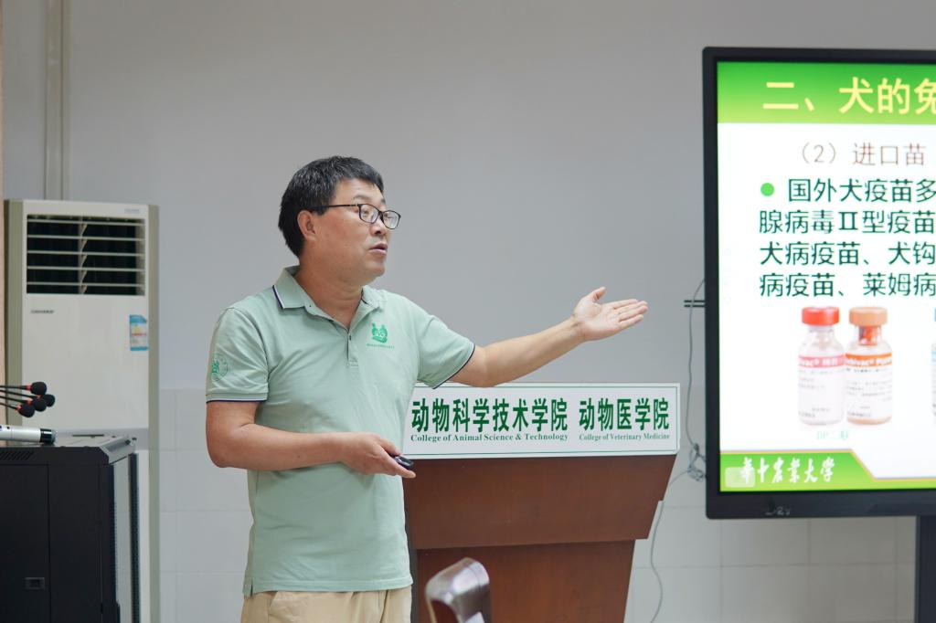 临床兽医学系副教授陈建国率先为同学们讲解宠物饲养的相关知识。陈建国结合自身从业经验,将宠物饲养知识分为“抱、溜、喂、药”四个方面与同学们分享。“对养宠物的人来说,遛狗是个大问题。特别是二哈,它们精力太旺盛了,很喜欢拆家的;养猫的人呢,就是铲屎官,得伺候好猫主子,还得小心被猫抓伤。”陈建国凭借幽默风趣的语言活跃了现场氛围。针对同学提出的宠物接种疫苗时间这一问题,陈建国进行了详细解答:“刚出生的小奶猫和小奶狗最好是先带回家先适应环境,半个月后再视情况而定;健康状态不佳及孕期的动物则不接种疫苗。”