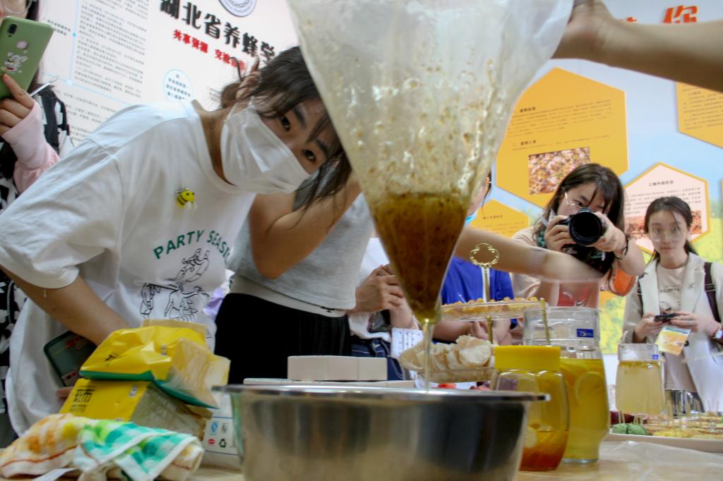 随后,湖北省养蜂学会的成员就蜜蜂的基础知识进行有奖问答,同学们踊跃参与、收获颇丰。在美食品鉴环节中,手摇蜜、蜂巢蜜等蜂蜜都让同学们赞不绝口。