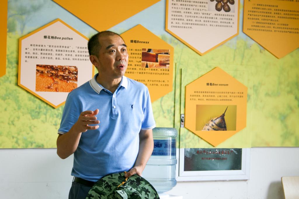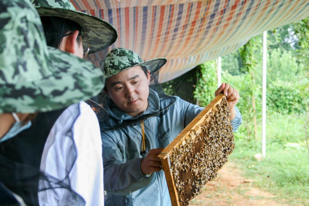 走出蜂场内部,琳琅满目的蜂产品映入眼帘。李翔谈起蜜蜂时,眼睛里充满光。“蜜蜂是自然之桥,农业之翼。”他指出,蜜蜂作为自然界最重要的一类传粉昆虫,极大地丰富了生物多样性,是连接自然的桥梁、农业腾飞的翅膀。国家主席习近平对蜜蜂也有极高的评价:“蜜蜂授粉的‘月下老人’作用,对农业的生态、增产效果应刮目相看。”李翔认为:蜂产业是绿色、甜蜜、健康的产业,与“大健康”的理念一致,值得同学们日后进行深入研究。