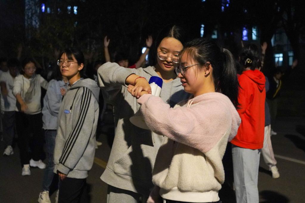 10月10日到10月21日晚的樱花大道上,120人的大型广播操方阵排列整齐,各训操员手持喇叭,耐心讲解每个动作要领。伴着广播体操音乐声,同学们整齐划一的动作令人赏心悦目。