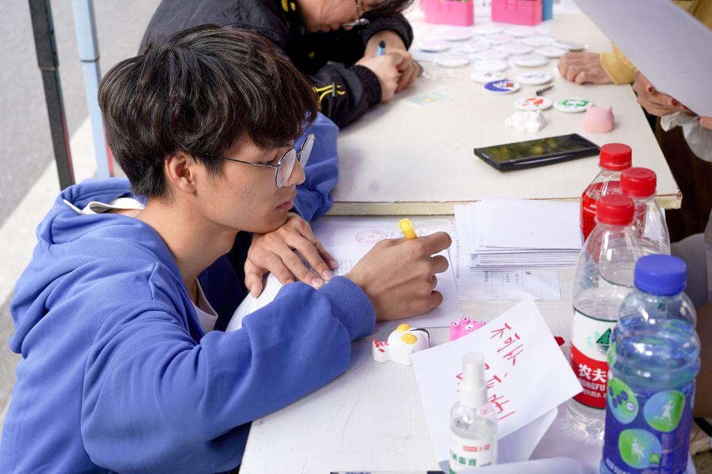 线下活动“线条——生命的跳跃”和“绘景——生命的色彩”于31日在荟园主干道进行。现场同学在完成有关生命的一系列问答后,在石膏娃娃或空白徽章上进行涂色和绘画。同学们可以自行发挥想象力,根据自身对于生命的见解,用活力跳跃的线条,表达生命的蓬勃,用多彩的颜色,展现生命的美好。“这道题选择B项‘亮度’,狗的视锥细胞不发达,对颜色的辨识度不高,所以导盲犬是靠亮度区分后绿灯的。”问答环节里的问题涵盖动物分类、动物发育、动物行为等方面的常识,贴近生活且趣味盎然。动医2005班廖怡梦感慨道:“能够用课本上的知识解释实际问题,感觉很有成就感。”
